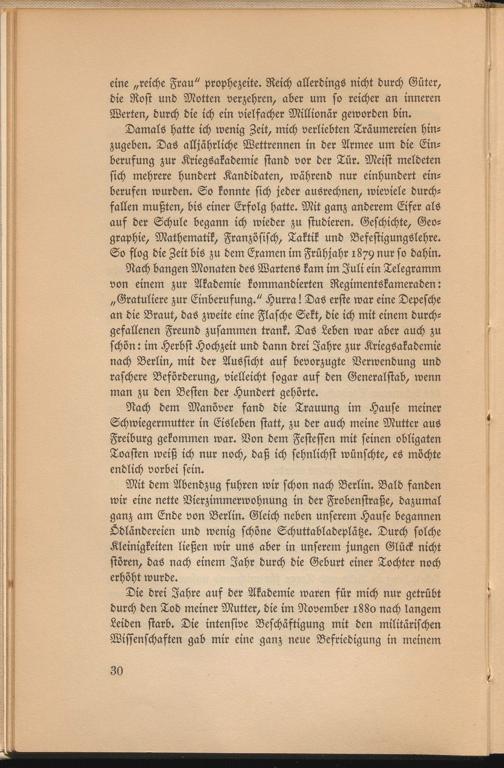 Die drei Jahre auf der Akademie waren für mich nur getrübt durch den Tod meiner Mutter, die im November 1880 nach langem Leiden starb. Die intensive Beschäftigung mit den militärischen Wissenschaften gab mir eine ganz neue Befriedigung in meinem