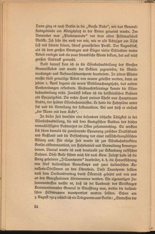 Bald darauf kam ich in die Eisenbahnabteilung des Großen Generalstabes und wurde der Sektion zugewiesen, die Mobil- machungs- und Aufmarschtransporte bearbeitete. In jedem Winter mußte diese gewaltige Arbeit von neuem geleistet werden, denn an jedem l. April begann ein neues Mobilmachungöjahr, das andere Vorbereitungen erforderte. Weihnachtsfeiertage kannte die Eisenbahnabteilung nicht. Zunächst bekam ich die holsteinischen Bahnen als Spezialgebiet. Die rechte Hand meines Chefs war Hauptmann Budde, der spätere Eisenbahnminister. Er hatte die Fahrpläne unter sich und die Verteilung der Lokomotiven. Bei uns hieß er einfach „der Mann mit dem Koks".