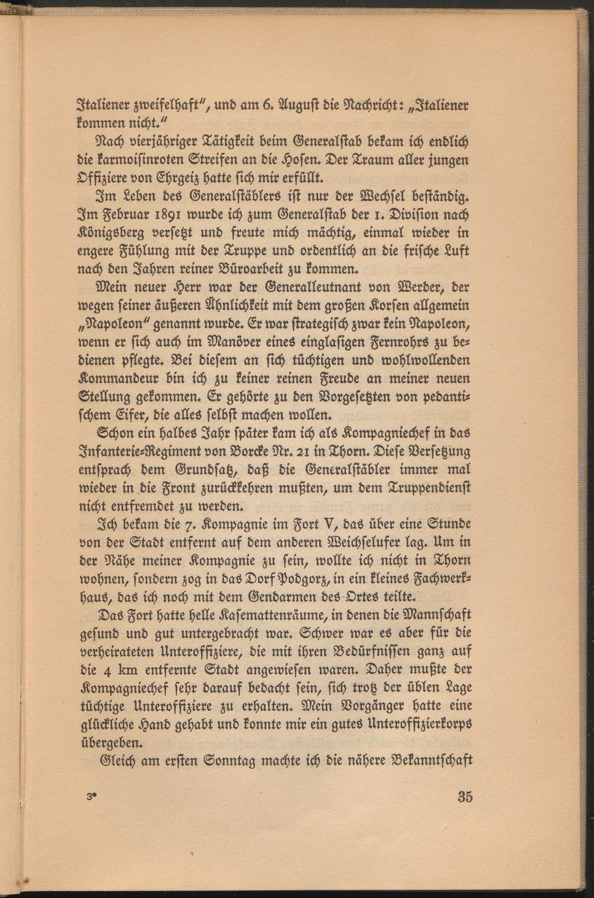 Mein neuer Herr war der Generalleutnant von Werder, der wegen seiner äußeren Ähnlichkeit mit dem großen Korsen allgemein „Napoleon" genannt wurde. Er war strategisch zwar kein Napoleon, wenn er sich auch im Manöver eines eittglasigen Fernrohrs zu bedienen pflegte. Bei diesem an sich tüchtigen und wohlwollenden Kommandeur bin ich zu keiner reinen Freude an meiner neuen Stellung gekommen. Er gehörte zu den Vorgesetzten von pedantischem Eifer, die alles selbst machen wollen.