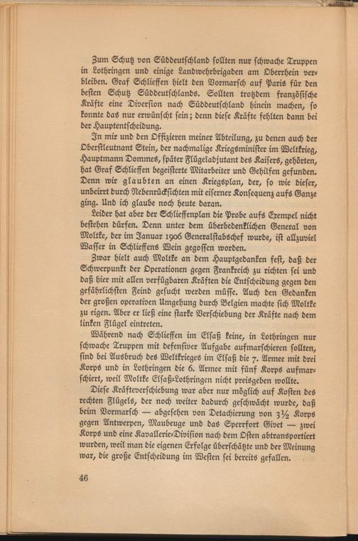 In mir und den Offizieren meiner Abteilung, zu denen auch der Oberstleutnant Stein, der nachmalige Kriegsminister im Weltkrieg, Hauptmann Dommes, später Flügeladjutant des Kaisers, gehörten, hat Graf Schliessen begeisterte Mitarbeiter und Gehilfen gefunden. Denn wir glaubten an einen KriegSplan, der, so wie dieser, unbeirrt durch Nebenrücksichten mit eiserner Konsequenz aufs Ganze ging. Und ich glaube noch heute daran.