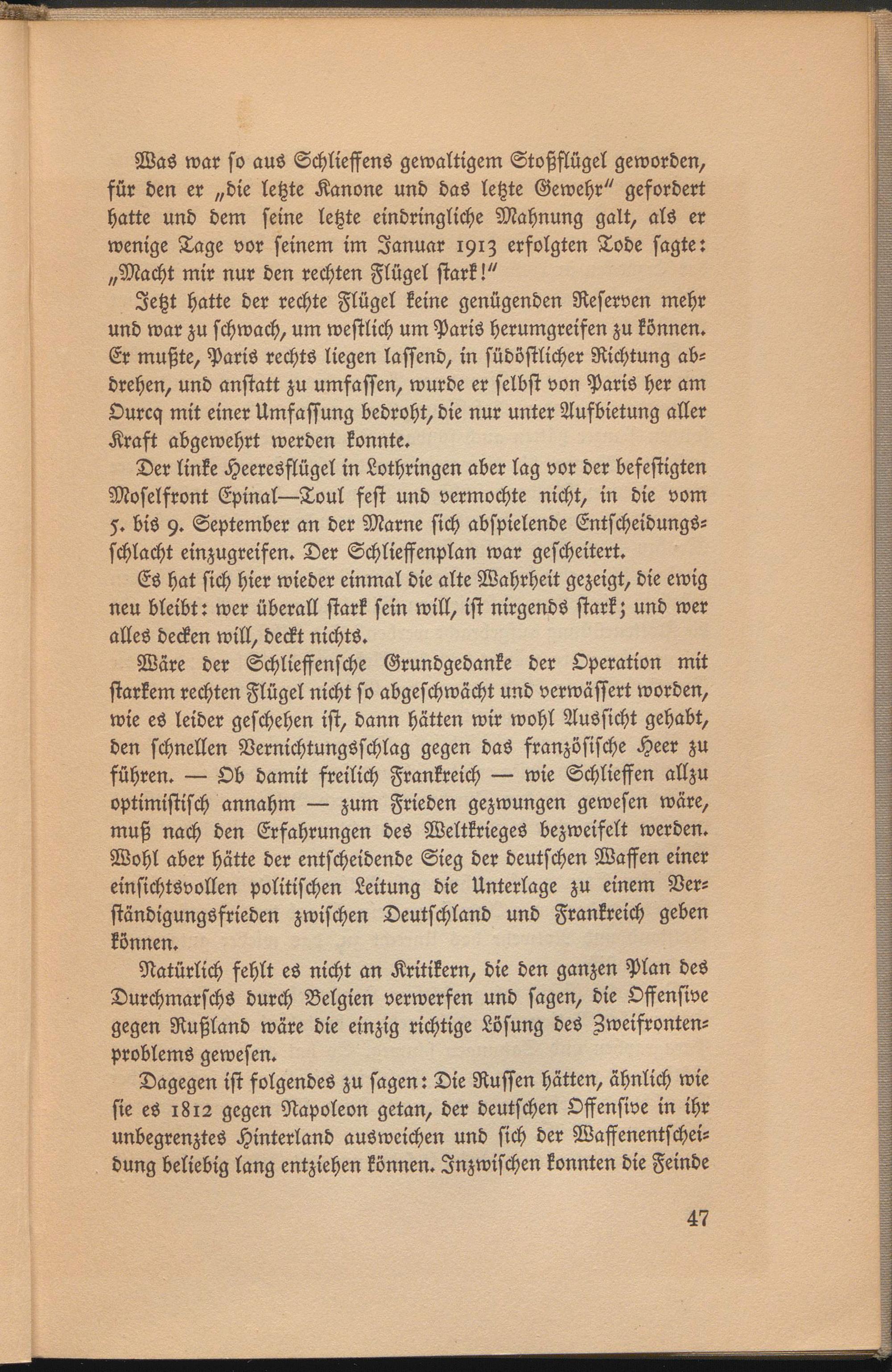 Wäre der Schlieffensche Grundgedanke der Operation mit starkem rechten Flügel nicht so abgeschwächt und verwässert worden, wie es leider geschehen ist, dann hätten wir wohl Aussicht gehabt, den schnellen Vernichtungsschlag gegen das französische Heer zu führen. — Ob damit freilich Frankreich — wie Schliessen allzu optimistisch annahm — zum Frieden gezwungen gewesen wäre, muß nach den Erfahrungen des Weltkrieges bezweifelt werden. Wohl aber hätte der entscheidende Sieg der deutschen Waffen einer einsichtsvollen politischen Leitung die Unterlage zu einem Ver- ständigungöfrieden zwischen Deutschland und Frankreich geben können.