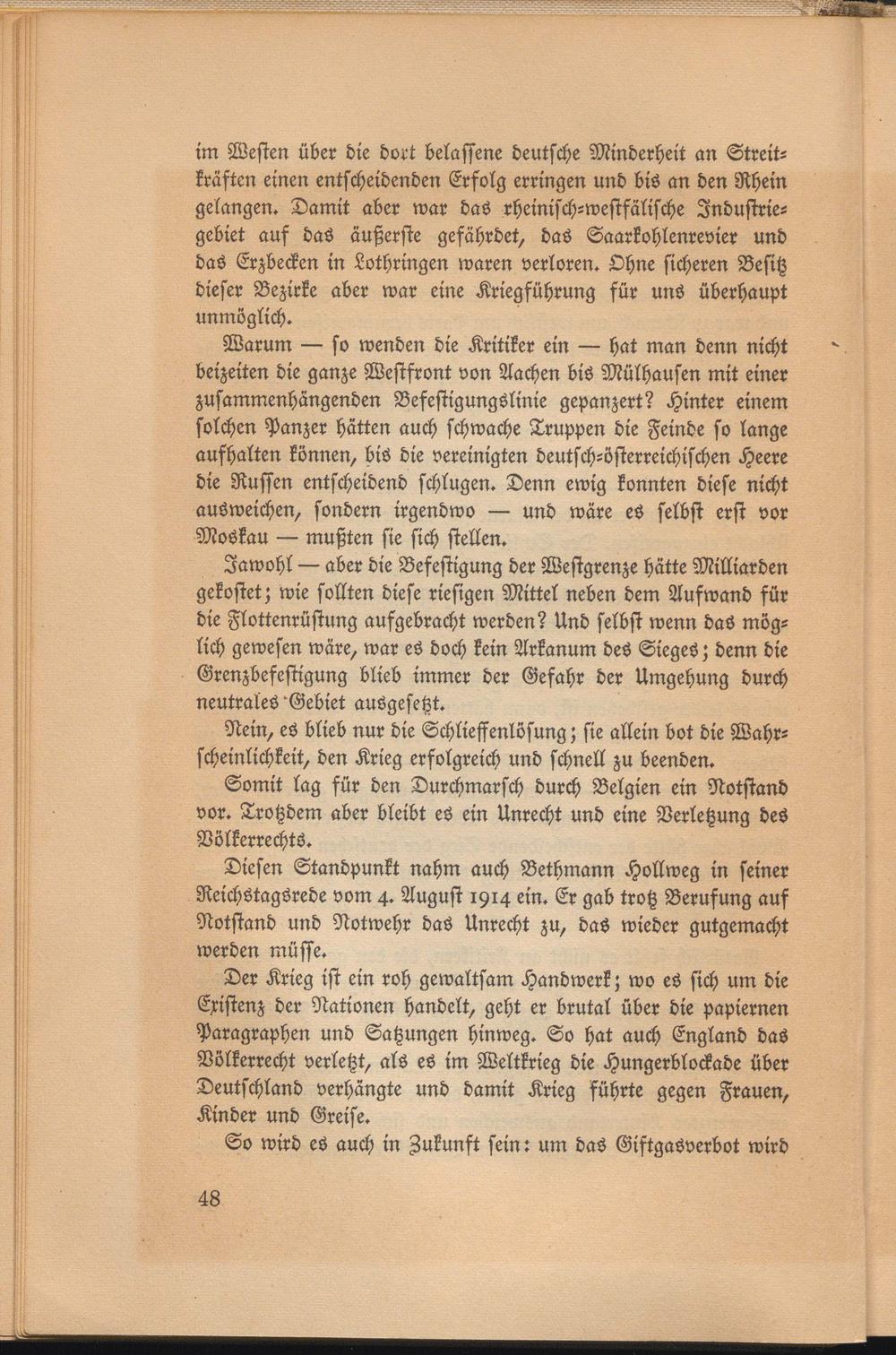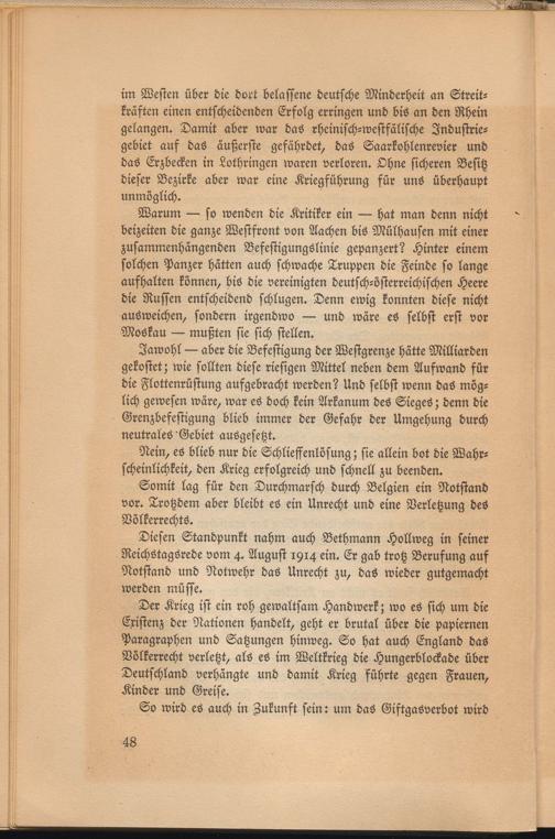 Der Krieg ist ein roh gewaltsam Handwerk; wo es sich um die Existenz der Nationen handelt, geht er brutal über die papiernen Paragraphen und Satzungen hinweg. So hat auch England das Völkerrecht verletzt, als es im Weltkrieg die Hungerblockade über Deutschland verhängte und damit Krieg führte gegen Frauen, Kinder und Greise.