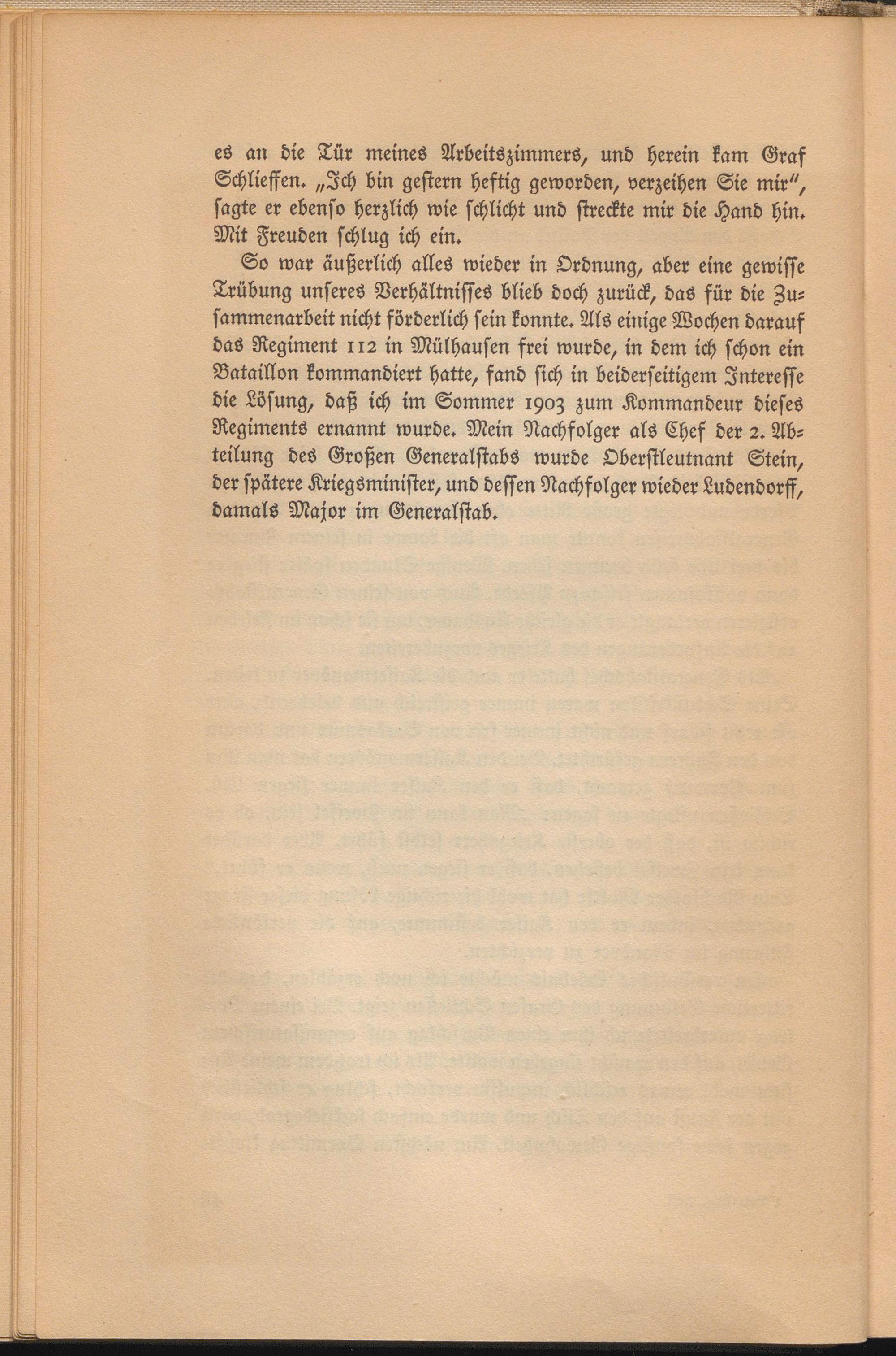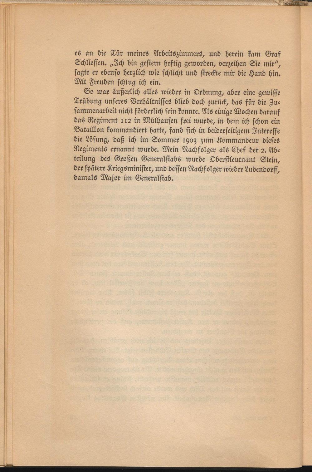 So war äußerlich alles wieder in Ordnung, aber eine gewisse Trübung unseres Verhältnisses blieb doch zurück, das für die Zusammenarbeit nicht förderlich sein konnte. Als einige Wochen darauf das Regiment 112 in Mülhausen frei wurde, in dem ich schon ein Bataillon kommandiert hatte, fand sich in beiderseitigem Interesse die Lösung, daß ich im Sommer 190z zum Kommandeur dieses Regiments ernannt wurde. Mein Nachfolger als Chef der 2. Abteilung des Großen Generalstabs wurde Oberstleutnant Stein, der spätere Kriegsminister, und dessen Nachfolger wieder Ludendorff, damals Major im Generalstab.