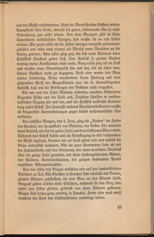 Als wir uns der Insel Madeira näherten, tauchten Schwärme fliegender Fische aus der Tiefe auf, Delphine schoflen in unübertrefflicher Eleganz hin und her, und ein Haifisch umkreiste stundenlang unser Schiff. Im Interesse unseres Munitionsbestandes mußte ich kriegerische Unternehmungen gegen dieses unsympathische Tier verbieten.
