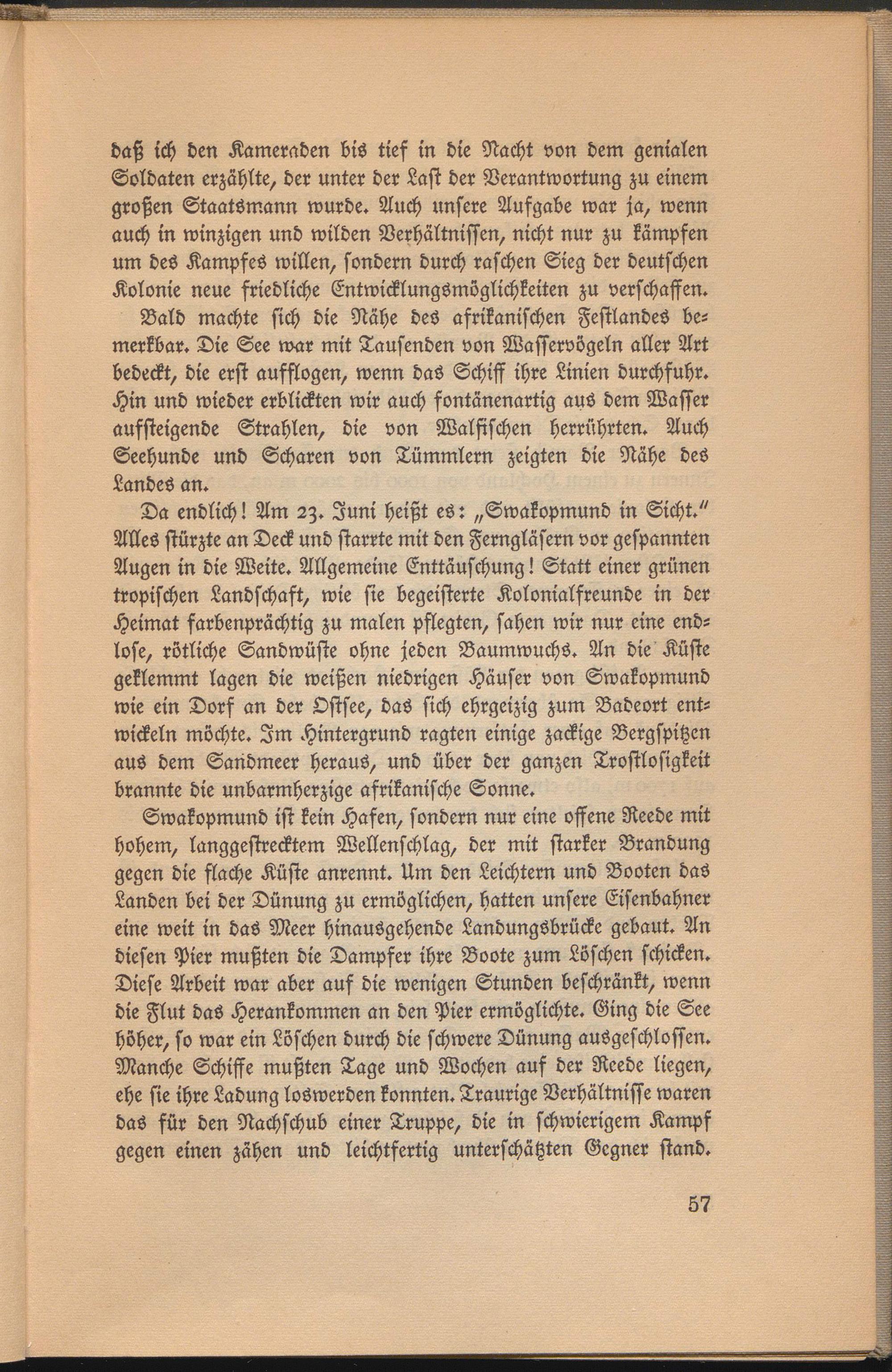 Da endlich! Am 2g. Juni heißt es: „Swakopmund in Sicht." Alles stürzte an Deck und starrte mit den Ferngläsern vor gespannten Augen in die Weite. Allgemeine Enttäuschung! Statt einer grünen tropischen Landschaft, wie sie begeisterte Kolonialfreunde in der Heimat farbenprächtig zu malen pflegten, sahen wir nur eine endlose, rötliche Sandwüste ohne jeden Baumwuchs. An die Küste geklemmt lagen die weißen niedrigen Häuser von Swakopmund wie ein Dorf an der Ostsee, daö sich ehrgeizig zum Badeort entwickeln möchte. Im Hintergrund ragten einige zackige Bergspitzen aus dem Sandmeer heraus, und über der ganzen Trostlosigkeit brannte die unbarmherzige afrikanische Sonne.
