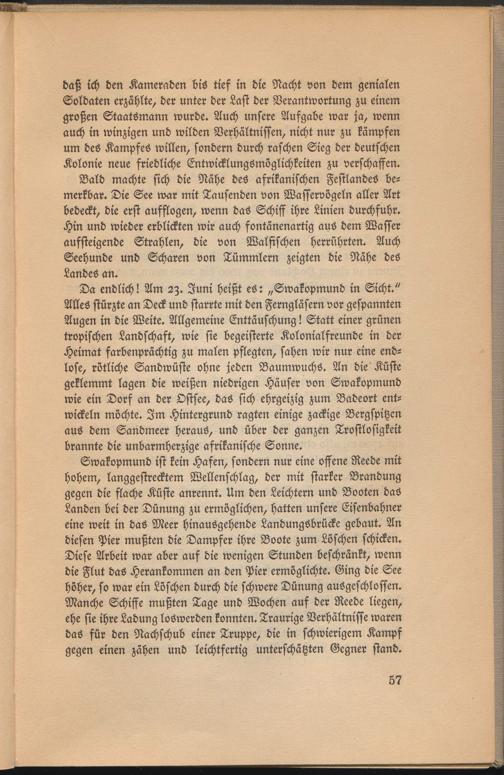 daß ich den Kameraden bis tief in die Nacht von dem genialen Soldaten erzählte, der unter der Last der Verantwortung zu einem großen Staatsmann wurde. Auch unsere Aufgabe war ja, wenn auch in winzigen und wilden Verhältnissen, nicht nur zu kämpfen um des Kampfes willen, sondem durch raschen Sieg der deutschen Kolonie neue friedliche Entwicklungsmöglichkeiten zu verschaffen.