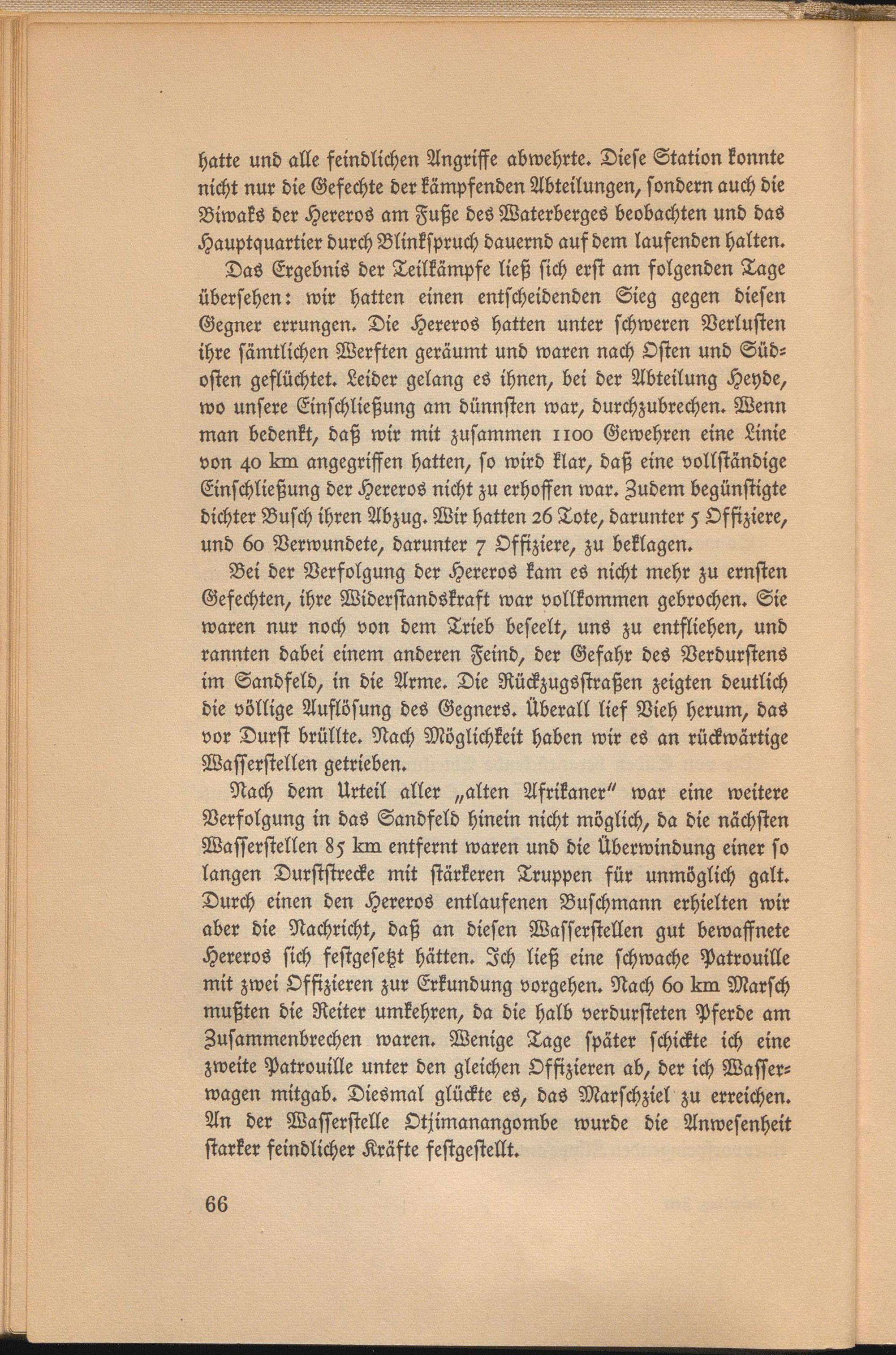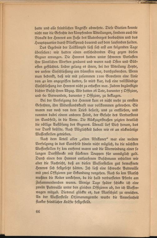 Das Ergebnis der Teilkämpfe ließ sich erst am folgenden Tage übersehen: wir hatten einen entscheidenden Sieg gegen diesen Gegner errungen. Die Hereros hatten unter schweren Verlusten ihre sämtlichen Werften geräumt und waren nach Osten und Südosten geflüchtet. Leider gelang es ihnen, bei der Abteilung Heyde, wo unsere Einschließung am dünnsten war, durchzubrechen. Wenn man bedenkt, daß wir mit zusammen 1100 Gewehren eine Linie von 40 1cm angegriffen hatten, so wird klar, daß eine vollständige Einschließung der Hereros nicht zu erhoffen war. Zudem begünstigte dichter Busch ihren Abzug. Wir hatten 26 Tote, darunter 5 Offiziere, und 60 Verwundete, darunter 7 Offiziere, zu beklagen.