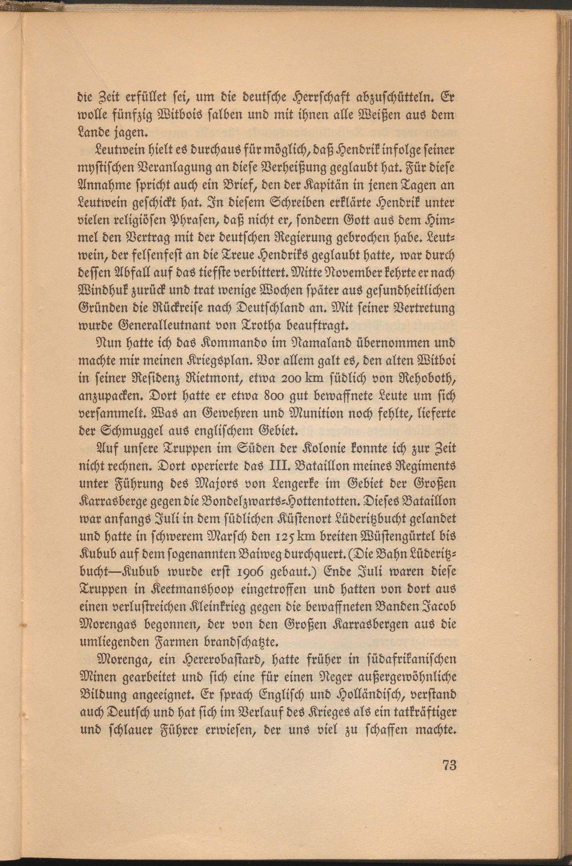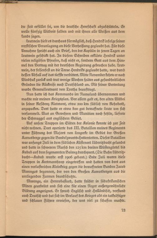 Morenga, ein Hererobastard, hatte früher in südafrikanischen Minen gearbeitet und sich eine für einen Neger außergewöhnliche Bildung angeeignet. Er sprach Englisch und Holländisch, verstand auch Deutsch und hat sich im Verlauf des Krieges als ein tatkräftiger und schlauer Führer erwiesen, der uns viel zu schaffen machte.