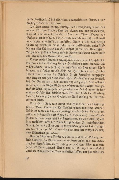 Die Lage wurde kritisch. Infolge von Detachierungen auf das andere Ufer des Auob zählte die Kompagnie nur 50 Gewehre, während uns etwa dreihundert Mann von Simon Copper aus Gochas gegenüberlagen. Die Hottentotten erkannten ihren Vorteil und suchten uns links zu umfassen. Gegen 4 Uhr nachmittags schickte ich Befehl an die zurückgelassene Halbbatterie, unter Aufbietung aller Kräfte auf das Gefechtsfeld zu kommen. Unteroffizier Brehm vom Feldsignaltrupp raste in Karriere mit dieser Order unter den Schüssen der Hottentotten zurück.