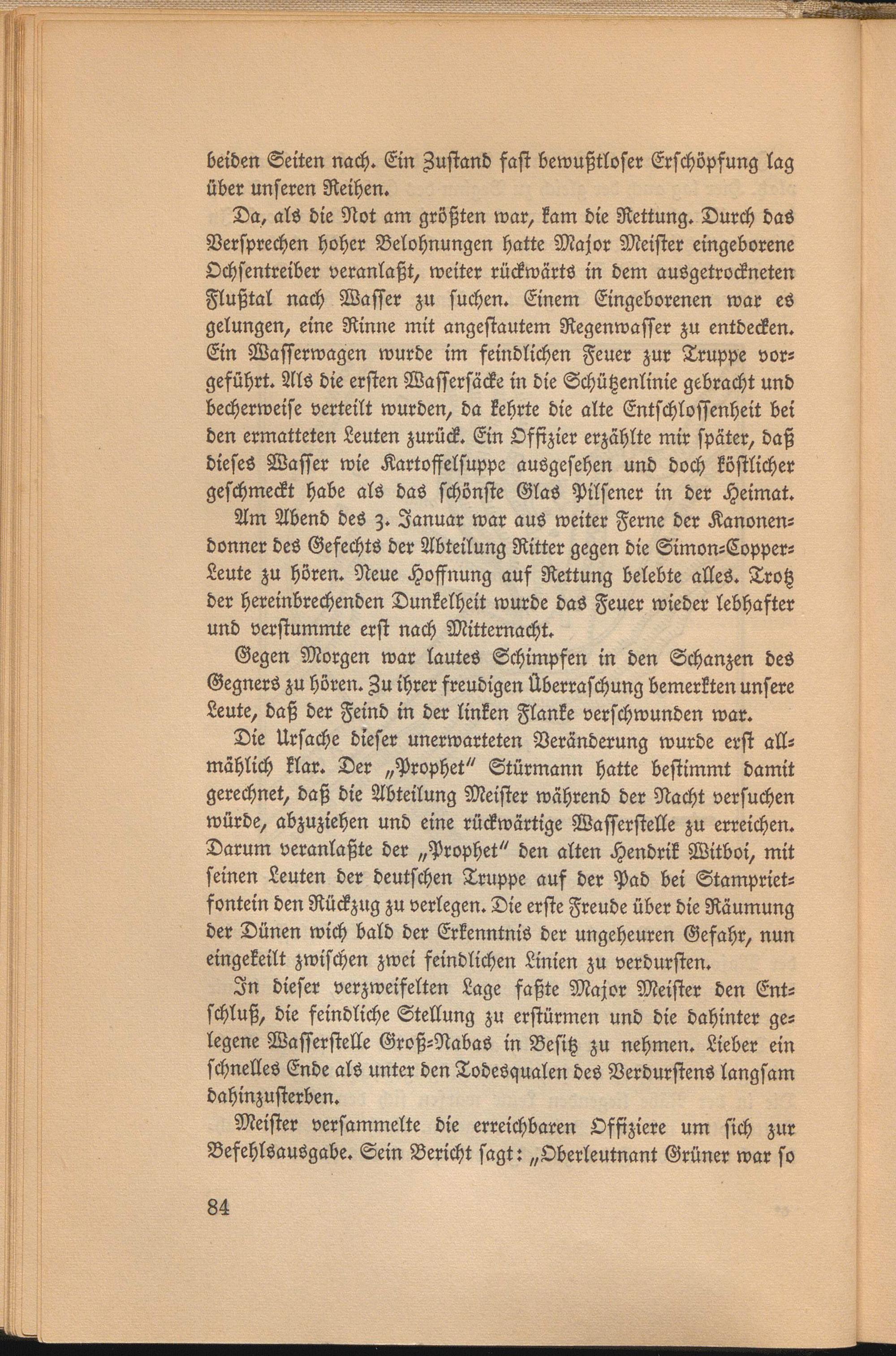 Da, als die Not am größten war, kam die Rettung. Durch das Versprechen hoher Belohnungen hatte Major Meister eingeborene Ochsentreiber veranlaßt, weiter rückwärts in dem ausgetrockneten Flußtal nach Wasser zu suchen. Einem Eingeborenen war es gelungen, eine Rinne mit angestautem Regenwasser zu entdecken. Ein Wasserwagen wurde im feindlichen Feuer zur Truppe vorgeführt. Als die ersten Waffersäcke in die Schützenlinie gebracht und becherweise verteilt wurden, da kehrte die alte Entschlossenheit bei den ermatteten Leuten zurück. Ein Offizier erzählte mir später, daß dieses Wasser wie Kartoffelsuppe ausgesehen und doch köstlicher geschmeckt habe als das schönste Glas Pilsener in der Heimat.
