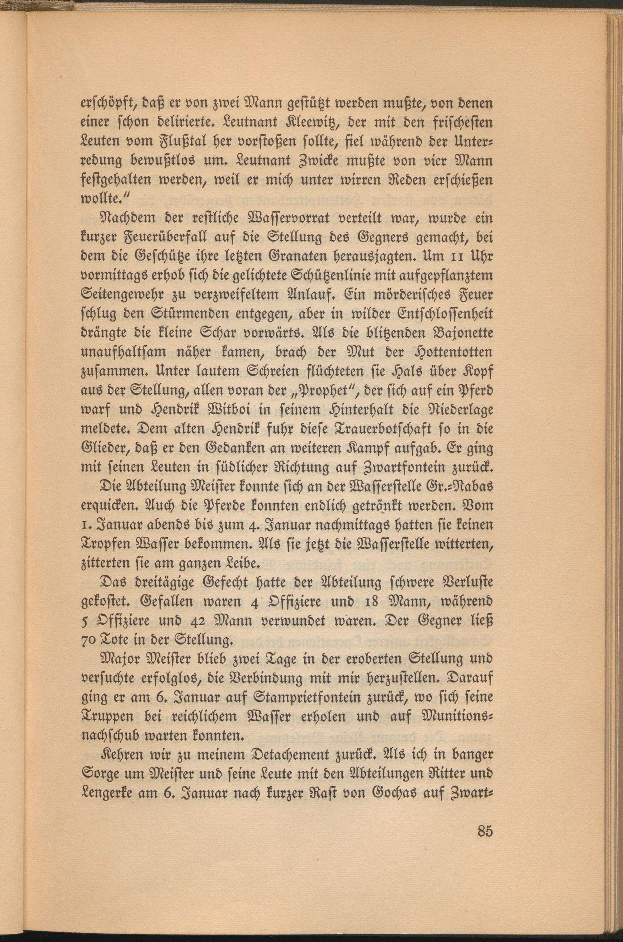 Nachdem der restliche Wasservorrat verteilt war, wurde ein kurzer Feuerüberfall auf die Stellung des Gegners gemacht, bei dem die Geschütze ihre letzten Granaten herausjagten. Um 11 Uhr vormittags erhob sich die gelichtete Schützenlinie mit aufgepflanztem Seitengewehr zu verzweifeltem Anlauf. Ein mörderisches Feuer schlug den Stürmenden entgegen, aber in wilder Entschlossenheit drängte die kleine Schar vorwärts. Als die blitzenden Bajonette unaufhaltsam näher kamen, brach der Mut der Hottentotten zusammen. Unter lautem Schreien flüchteten sie Hals über Kopf aus der Stellung, allen voran der „Prophet", der sich auf ein Pferd warf und Hendrik Witboi in seinem Hinterhalt die Niederlage meldete. Dem alten Hendrik fuhr diese Trauerbotschaft so in die Glieder, daß er den Gedanken an weiteren Kampf aufgab. Er ging mit seinen Leuten in südlicher Richtung auf Iwartfontein zurück.