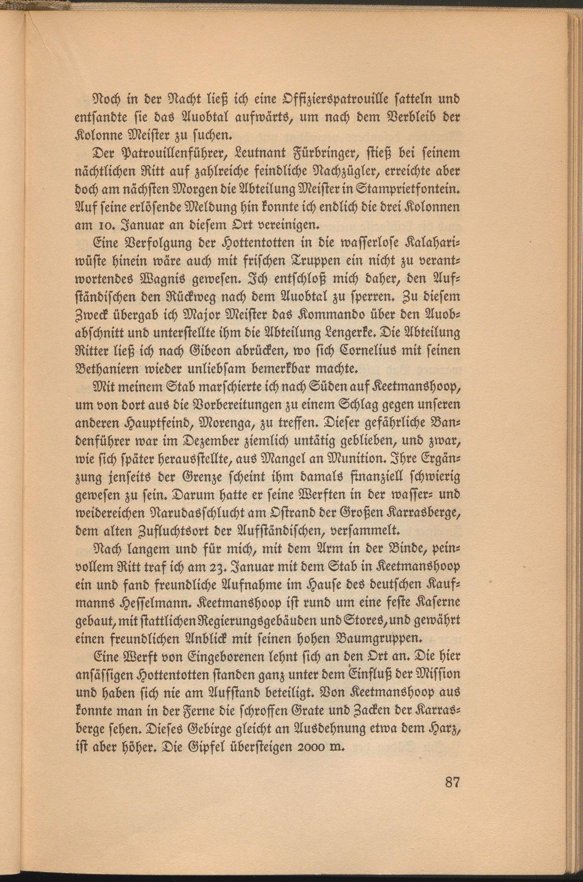 Nach langem und für mich, mit dem Arm in der Binde, pein- vollem Ritt traf ich am 2z. Januar mit dem Stab in Keetmanshoop ein und fand freundliche Aufnahme im Hause des deutschen Kaufmanns Hesselmann. Keetmanshoop ist rund um eine feste Kaserne gebaut, mit stattlichen Regierungsgebäuden und Stores, und gewährt einen freundlichen Anblick mit seinen hohen Baumgruppen.