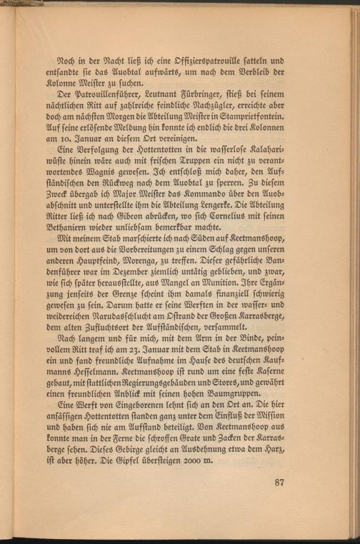 Mit meinem Stab marschierte ich nach Süden auf Keetmanshoop, um von dort aus die Vorbereitungen zu einem Schlag gegen unseren anderen Hauptfeind, Morenga, zu treffen. Dieser gefährliche Ban- denführer war im Dezember ziemlich untätig geblieben, und zwar, wie sich später herausstellte, aus Mangel an Munition. Ihre Ergänzung jenseits der Grenze scheint ihm damals finanziell schwierig gewesen zu sein. Darum hatte er seine Werften in der waffer- und Weidereichen Narudasschlucht am Ostrand der Großen Karrasberge, dem alten Zufluchtsort der Aufständischen, versammelt.