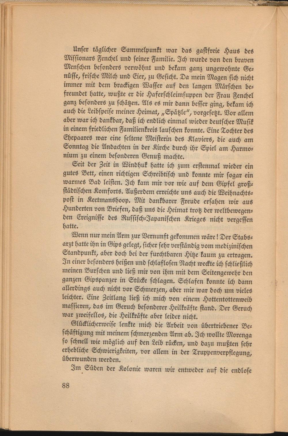 Wenn nur mein Arm zur Vernunft gekommen wäre! Der Stabsarzt hatte ihn in Gips gelegt, sicher sehr verständig vom medizinischen Standpunkt, aber doch bei der furchtbaren Hitze kaum zu ertragen. In einer besonders heißen und schlaflosen Nacht weckte ich schließlich meinen Burschen und ließ mir von ihm mit dem Seitengewehr den ganzen Gipspanzer in Stücke schlagen. Schlafen konnte ich dann allerdings auch nicht vor Schmerzen, aber mir war doch um vieles leichter. Eine Zeitlang ließ ich mich von einem Hottentottenweib massieren, das im Geruch besonderer Heilkräfte stand. Der Geruch war zweifellos, die Heilkräfte aber leider nicht.