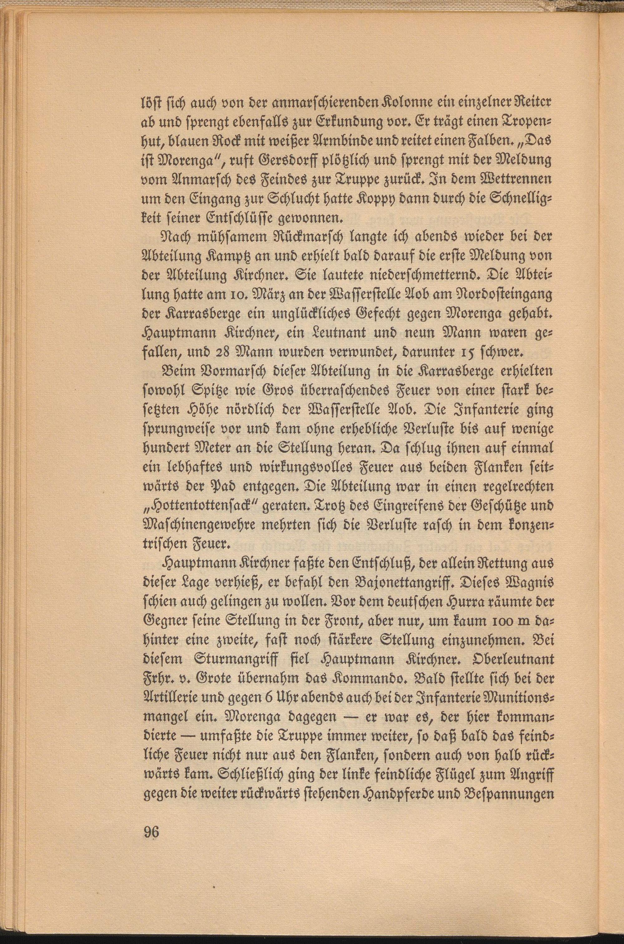 Nach mühsamem Rückmarsch langte ich abends wieder bei der Abteilung Kamptz an und erhielt bald darauf die erste Meldung von der Abteilung Kirchner. Sie lautete niederschmetternd. Die Abteilung hatte am 10. März an der Wasserstelle Aob am Nordosteingang der KarraSberge ein unglückliches Gefecht gegen Morenga gehabt. Hauptmann Kirchner, ein Leutnant und neun Mann waren gefallen, und 28 Mann wurden verwundet, darunter 15 schwer.