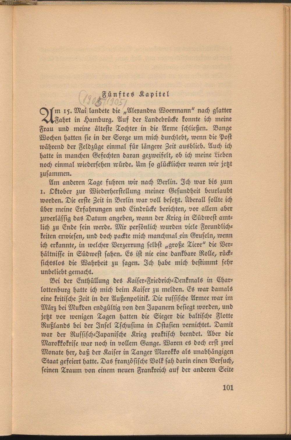 Am anderen Tage fuhren wir nach Berlin. Ich war bis zum i. Oktober zur Wiederherstellung meiner Gesundheit beurlaubt worden. Die erste Zeit in Berlin war voll besetzt. Überall sollte ich über meine Erfahrungen und Eindrücke berichten, vor allem aber zuverlässig das Datum angeben, wann der Krieg in Südwest amtlich zu Ende sein werde. Mir persönlich wurden viele Freundlichkeiten erwiesen, und doch packte mich manchmal.ein Gruseln, wenn ich erkannte, in welcher Verzerrung selbst „große Tiere" die Verhältnisse in Südwest sahen. Es ist nie eine dankbare Rolle, rücksichtslos die Wahrheit zu sagen. Ich habe mich bestimmt sehr unbeliebt gemacht.