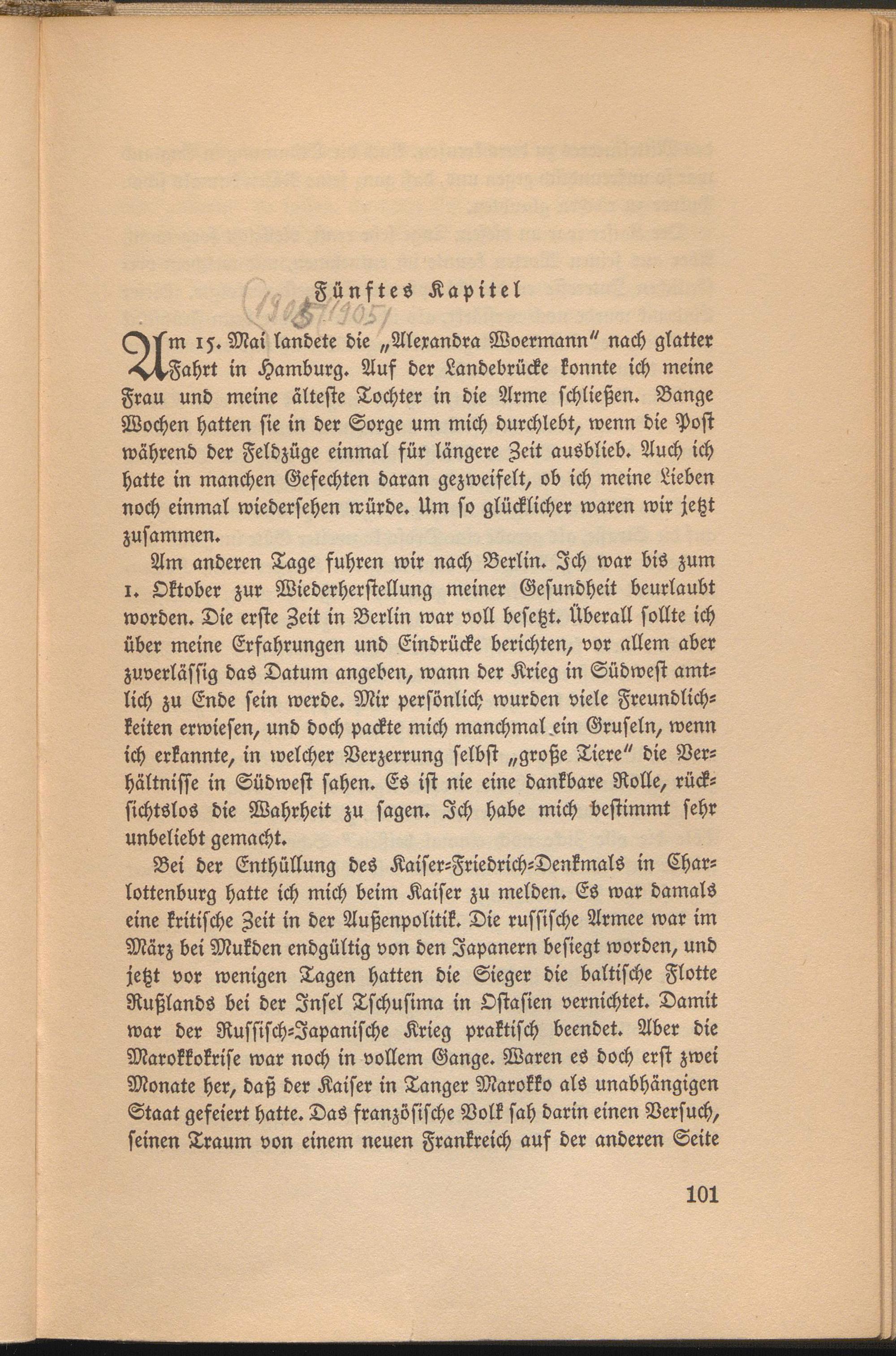 Bei der Enthüllung des Kaiser-Friedrich-Denkmals in Char- lottenburg hatte ich mich beim Kaiser zu melden. Es war damals eine kritische Zeit in der Außenpolitik. Die russische Armee war im März bei Mukden endgültig von den Japanern besiegt worden, und jetzt vor wenigen Tagen hatten die Sieger die baltische Flotte Rußlands bei der Insel Tschusima in Ostasien vernichtet. Damit war der Russisch-Japanische Krieg praktisch beendet. Aber die Marokkokrise war noch in vollem Gange. Waren es doch erst zwei Monate her, daß der Kaiser in Tanger Marokko als unabhängigen Staat gefeiert hatte. Das französische Volk sah darin einen Versuch, seinen Traum von einem neuen Frankreich aus der anderen Seite