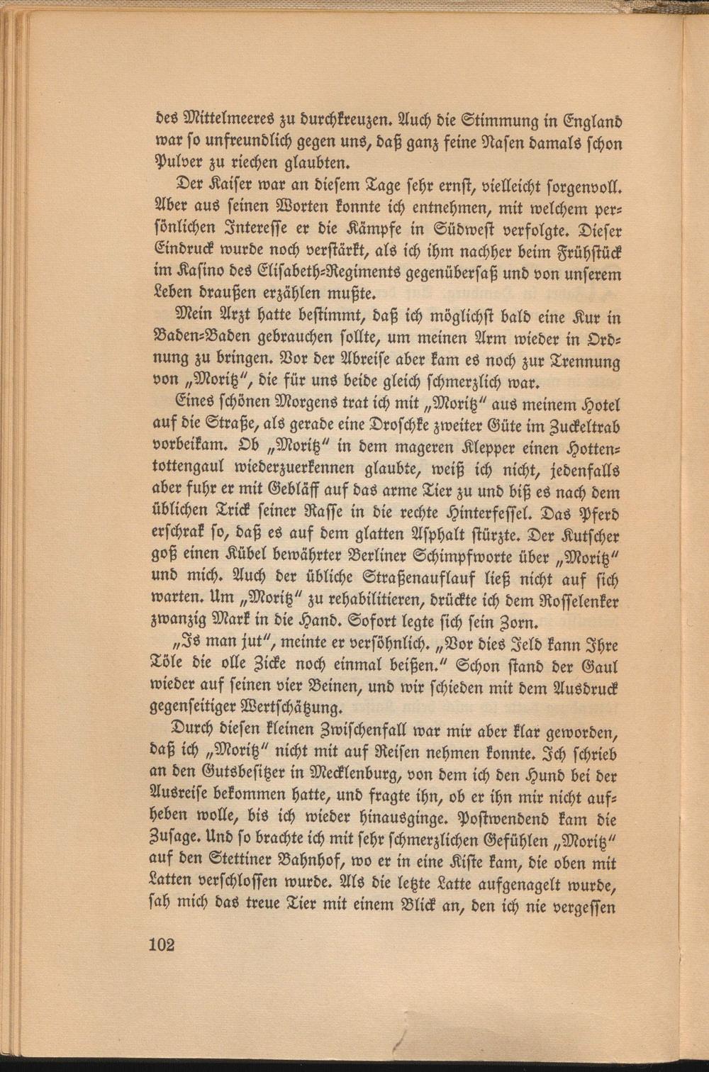 Durch diesen kleinen Zwischenfall war mir aber klar geworden, daß ich „Moritz" nicht mit auf Reisen nehmen konnte. Ich schrieb an den Gutsbesitzer in Mecklenburg, von dem ich den Hund bei der Ausreise bekommen hatte, und fragte ihn, ob er ihn mir nicht aufheben wolle, bis ich wieder hinausginge. Postwendend kam die Zusage. Und so brachte ich mit sehr schmerzlichen Gefühlen „Moritz" auf den Stettiner Bahnhof, wo er in eine Kiste kam, die oben mit Latten verschlossen wurde. Als die letzte Latte aufgenagelt wurde, sah mich das treue Tier mit einem Blick an, den ich nie vergessen