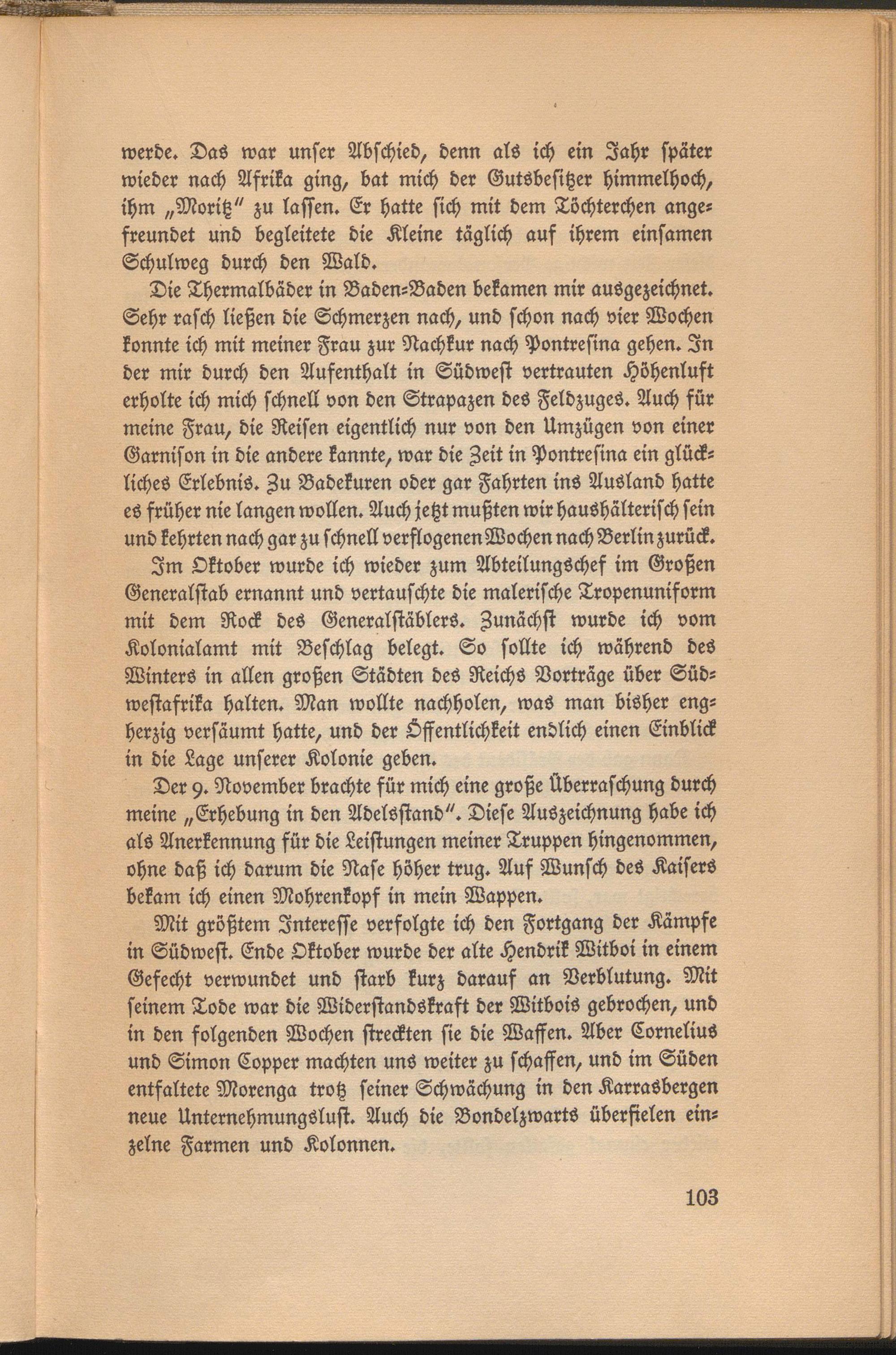 Mit größtem Interesse verfolgte ich den Fortgang der Kämpfe in Südwest. Ende Oktober wurde der alte Hendrik Witboi in einem Gefecht verwundet und starb kurz darauf an Verblutung. Mit seinem Tode war die Widerstandskraft der WitboiS gebrochen, und in den folgenden Wochen streckten sie die Waffen. Aber Cornelius und Simon Copper machten uns weiter zu schaffen, und im Süden entfaltete Morenga trotz seiner Schwächung in den KarraSbergen neue Unternehmungslust. Auch die Bondelzwarts überfielen einzelne Farmen und Kolonnen.