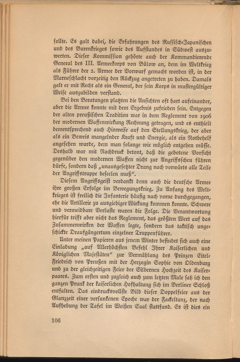 sollte. ES galt dabei, die Erfahrungen des Russisch-Japanischen und des Burenkrieges sowie des AusstandeS in Südwest auszuwerten. Dieser Kommission gehörte auch der Kommandierende General des III. Armeekorps von Bülow an, dem im Weltkrieg als Führer der 2. Armee der Vorwurf gemacht worden ist, in der Marneschlacht vorzeitig den Rückzug angetreten zu haben. Damals galt er mit Recht als ein General, der sein Korps in mustergültiger Weise auszubilden verstand.