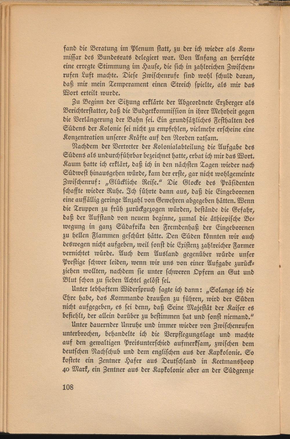 Nachdem der Vertreter der Kolonialabteilung die Aufgabe des Südens als undurchführbar bezeichnet hatte, erbat ich mir das Wort. Kaum hatte ich erklärt, daß ich in den nächsten Tagen wieder nach Südwest hinausgehen würde, kam der erste, gar nicht wohlgemeinte Zwischenruf: „Glückliche Reise." Die Glocke des Präsidenten schaffte wieder Ruhe. Ich führte dann aus, daß die Eingeborenen eine auffällig geringe Anzahl von Gewehren abgegeben hätten. Wenn die Truppen zu früh zurückgezogen würden, bestände die Gefahr, daß der Aufstand von neuem beginne, zumal die äthiopische Bewegung in ganz Südafrika den Fremdenhaß der Eingeborenen zu hellen Flammen geschirrt hätte. Den Süden könnten wir auch deswegen nicht aufgeben, weil sonst die Existenz zahlreicher Farmer vernichtet würde. Auch dem Ausland gegenüber würde unser Prestige schwer leiden, wenn wir unS von einer Aufgabe zurückziehen wollten, nachdem sie unter schweren Opfern an Gut und Blut schon zu sieben Achtel gelöst sei.