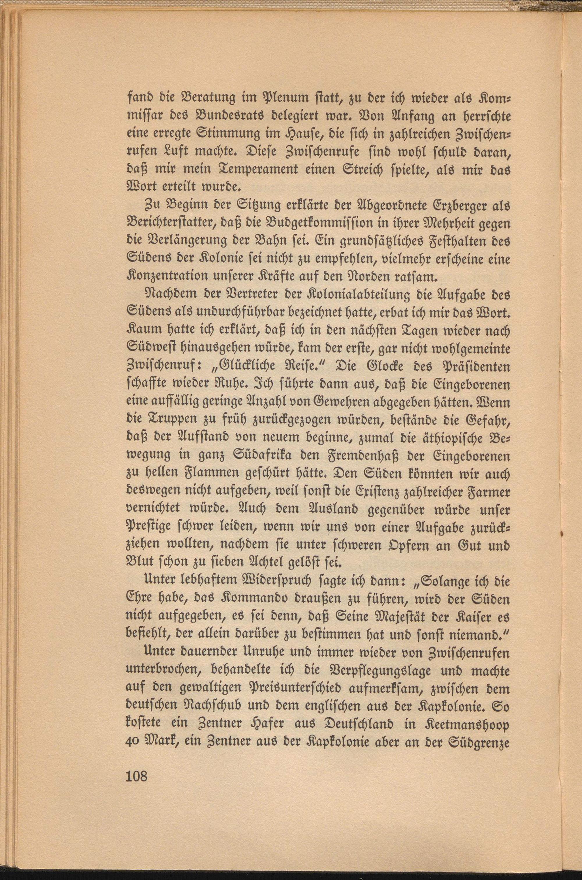 Unter dauernder Unruhe und immer wieder von Zwischenrufen unterbrochen, behandelte ich die Verpflegungslage und machte auf den gewaltigen Preisunterschied aufmerksam, zwischen dem deutschen Nachschub und dem englischen aus der Kapkolonie. So kostete ein Zentner Hafer aus Deutschland in Keetmanshoop 40 Mark, ein Zentner aus der Kapkolonie aber an der Südgrenze