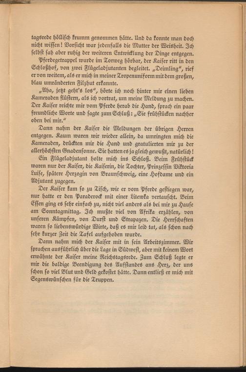 Dann nahm mich der Kaiser mit in sein Arbeitszimmer. Wir sprachen ausführlich über die Lage in Südwest, aber mit keinem Wort erwähnte der Kaiser meine Reichstagsrede. Zum Schluß legte er mir die baldige Beendigung des Aufstandes ans Herz, der uns schon so viel Blut und Geld gekostet hätte. Dann entließ er mich mit Segenswünschen für die Truppen.