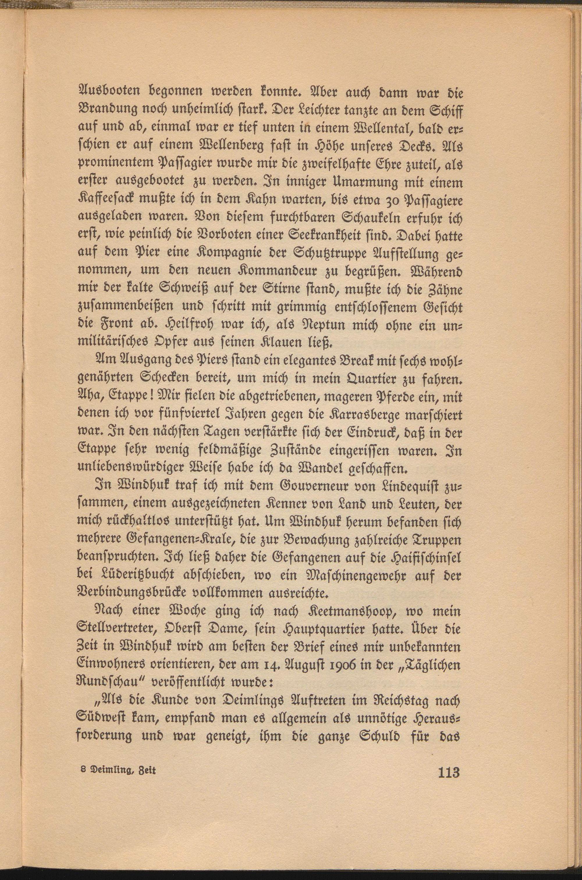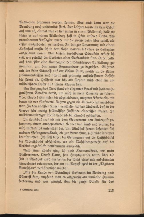 Ausbooten begonnen werden konnte. Aber auch dann war die Brandung noch unheimlich stark. Der Leichter tanzte an dem Schiff auf und ab, einmal war er tief unten in einem Wellental, bald erschien er auf einem Wellenberg fast in Höhe unseres Decks. Als prominentem Passagier wurde mir die zweifelhafte Ehre zuteil, als erster ausgebootet zu werden. In inniger Umarmung mit einem Kaffeesack mußte ich in dem Kahn warten, bis etwa zo Passagiere ausgeladen waren. Von diesem furchtbaren Schaukeln erfuhr ich erst, wie peinlich die Vorboten einer Seekrankheit sind. Dabei hatte auf dem Pier eine Kompagnie der Schutztruppe Aufstellung genommen, um den neuen Kommandeur zu begrüßen. Während mir der kalte Schweiß auf der Stirne stand, mußte ich die Zähne zusammenbeißen und schritt mit grimmig entschlossenem Gesicht die Front ab. Heilfroh war ich, als Neptun mich ohne ein un- militärisches Opfer aus seinen Klauen ließ.
