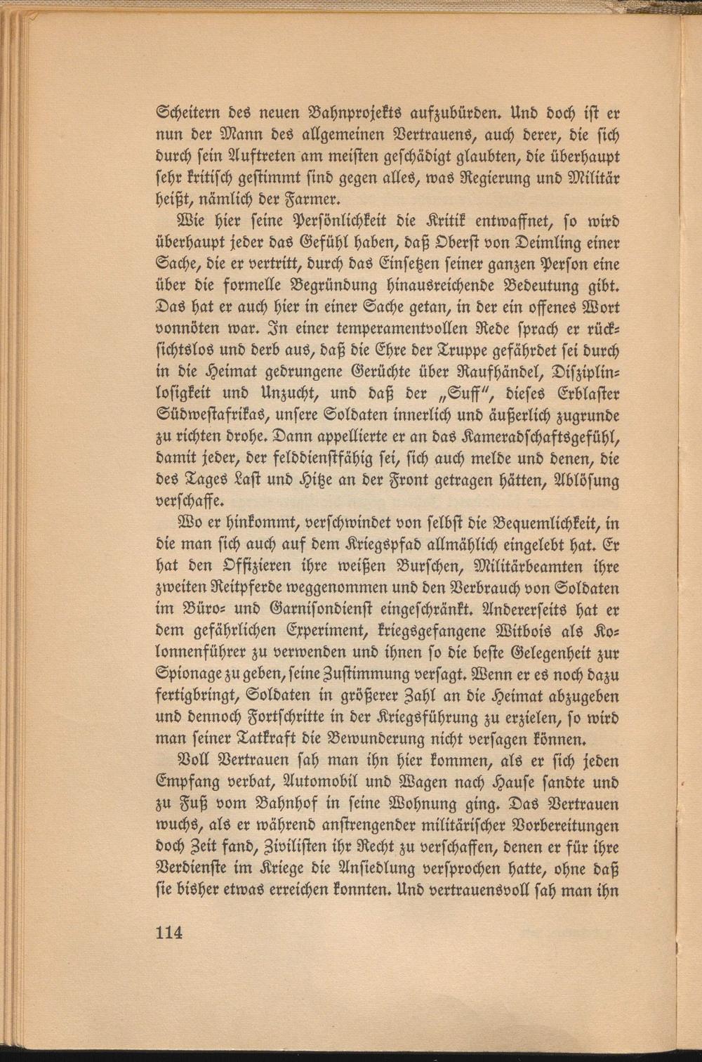 Wie hier seine Persönlichkeit die Kritik entwaffnet, so wird überhaupt jeder das Gefühl haben, daß Oberst von Deimling einer Sache, die er vertritt, durch das Einsetzen seiner ganzen Person eine über die formelle Begründung Hinausreichende Bedeutung gibt. Das hat er auch hier in einer Sache getan, in der ein offenes Wort vonnöten war. In einer temperamentvollen Rede sprach er rücksichtslos und derb aus, daß die Ehre der Truppe gefährdet sei durch in die Heimat gedrungene Gerüchte über Raufhändel, Disziplinlosigkeit und Unzucht, und daß der „Suff", dieses Erblaßter Südwestafrikas, unsere Soldaten innerlich und äußerlich zugrunde zu richten drohe. Dann appellierte er an das Kameradschaftsgefühl, damit jeder, der felddienstfähig sei, sich auch melde und denen, die des Tages Last und Hitze an der Front getragen hätten, Ablösung verschaffe.