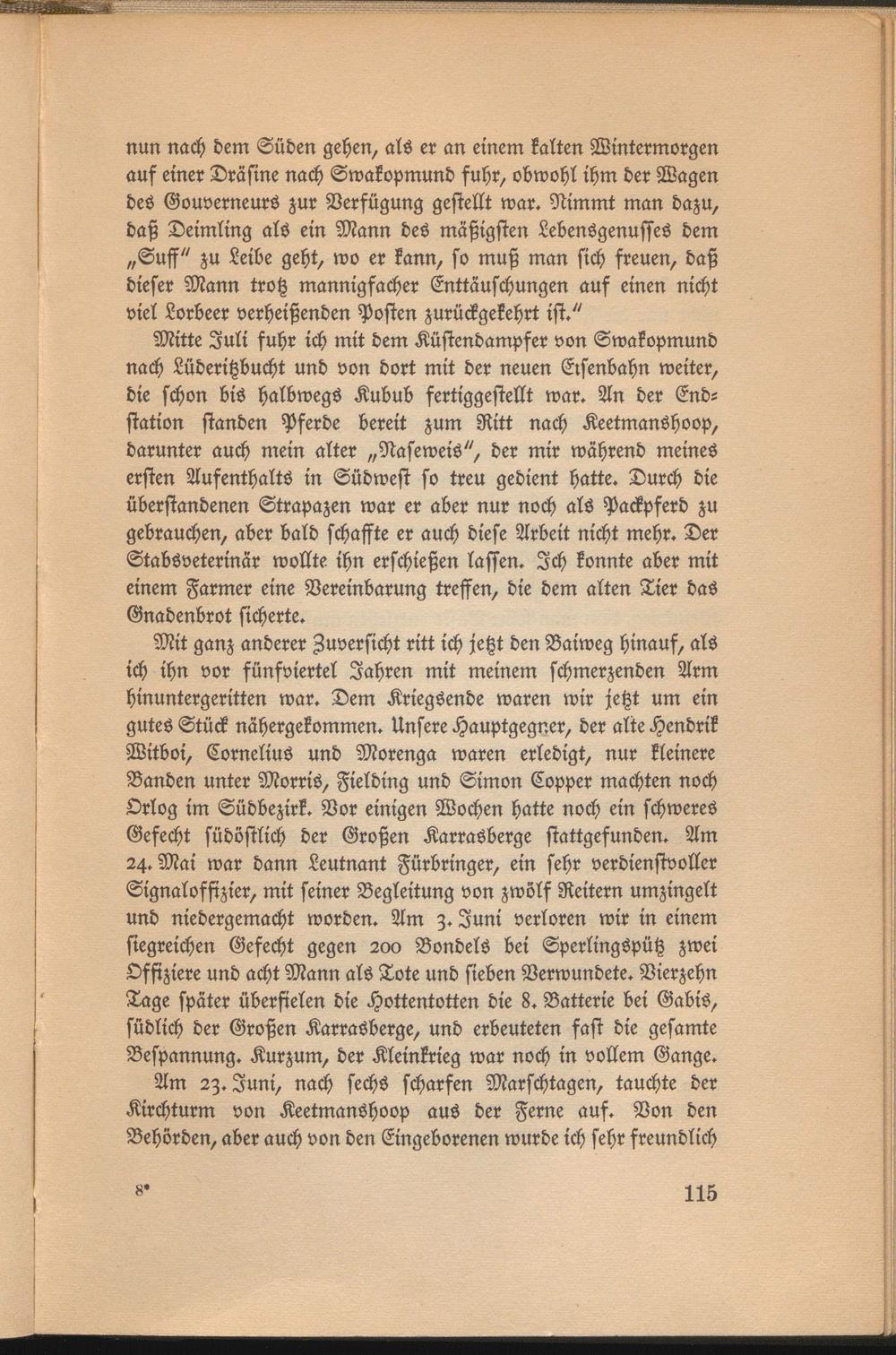 Mit ganz anderer Zuversicht ritt ich jetzt den Baiweg hinauf, als ich ihn vor fünfviertel Jahren mit meinem schmerzenden Arm hinuntergeritten war. Dem Kriegsende waren wir jetzt um ein gutes Stück nähergekommen. Unsere Hauptgegner, der alte Hendrik Witboi, Cornelius und Morenga waren erledigt, nur kleinere Banden unter Morris, Fielding und Simon Copper machten noch Orlog im Südbezirk. Vor einigen Wochen hatte noch ein schweres Gefecht südöstlich der Großen Karrasberge stattgefunden. Am 24. Mai war dann Leutnant Fürbringer, ein sehr verdienstvoller Signaloffizier, mit seiner Begleitung von zwölf Reitern umzingelt und niedergemacht worden. Am z. Juni verloren wir in einem siegreichen Gefecht gegen 200 Bondelö bei Sperlingspütz zwei Offiziere und acht Mann als Tote und sieben Verwundete. Vierzehn Tage später überfielen die Hottentotten die 8. Batterie bei Gabis, südlich der Großen Karrasberge, und erbeuteten fast die gesamte Bespannung. Kurzum, der Kleinkrieg war noch in vollem Gange.