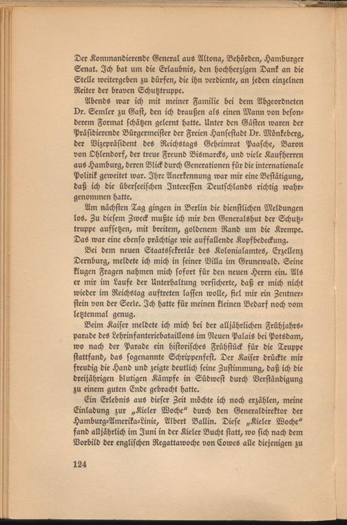 Am nächsten Tag gingen in Berlin die dienstlichen Meldungen los. Zu diesem Zweck mußte ich mir den Generalshut der Schutztruppe aufsetzen, mit breitem, goldenem Rand um die Krempe. Das war eine ebenso prächtige wie auffallende Kopfbedeckung.