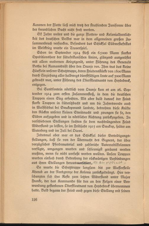 Elf Jahre weiter und die ganze Flotten- und Kolonialherrlich- keit des deutschen Volkes war in dem allgemeinen großen Zu- sammenbruch versunken. Besonders das Schicksal Südwestafrikas im Weltkrieg wurde ein Trauerspiel.