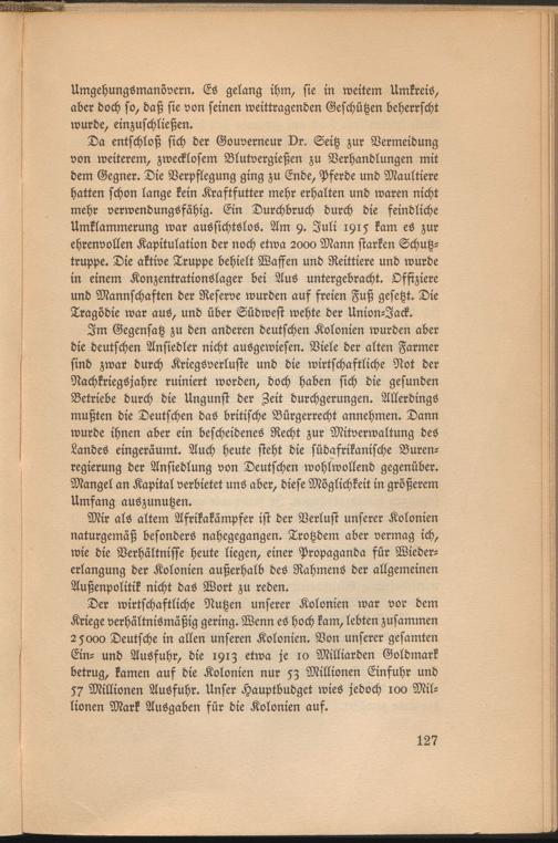 Mir als altem Afrikakämpfer ist der Verlust unserer Kolonien naturgemäß besonders nahegegangen. Trotzdem aber vermag ich, wie die Verhältnisse heute liegen, einer Propaganda für Wiedererlangung der Kolonien außerhalb des Rahmens der allgemeinen Außenpolitik nicht das Wort zu reden.