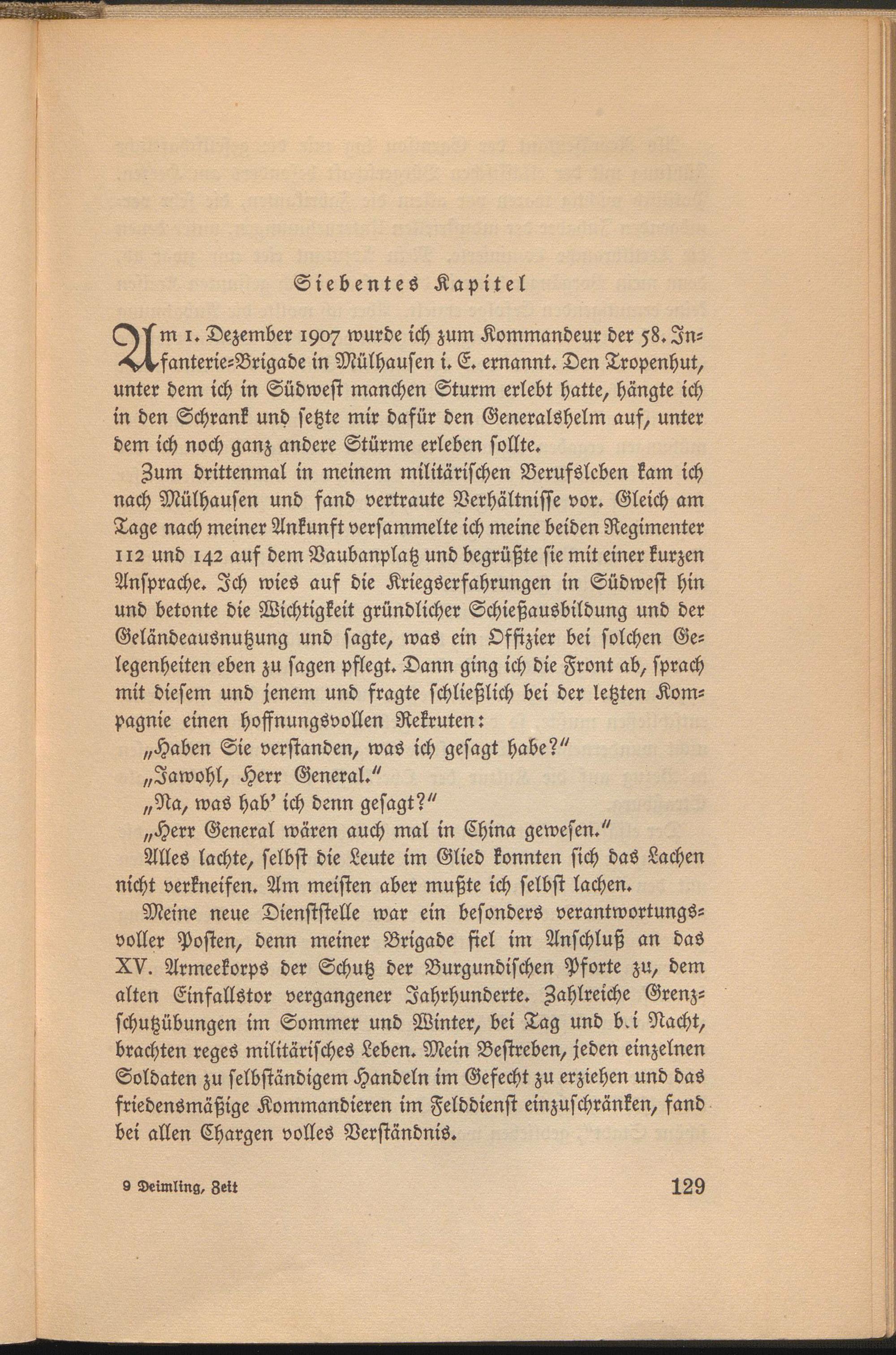 m i. Dezember 1907 wurde ich zum Kommandeur der 58. Jn- ^ 4 -fanterie-Brigade in Mülhausen i. E. emannt. Den Tropenhut, unter dem ich in Südwest manchen Sturm erlebt hatte, hängte ich in den Schrank und setzte mir dafür den Generalshelm auf, unter dem ich noch ganz andere Stürme erleben sollte.