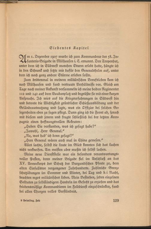 Zum drittenmal in meinem militärischen Berufsleben kam ich nach Mülhausen und fand vertraute Verhältnisse vor. Gleich am Tage nach meiner Ankunft versammelte ich meine beiden Regimenter 112 und 142 auf dem Vaubanplatz und begrüßte sie mit einer kurzen Ansprache. Ich wies auf die Kriegserfahrungen in Südwest hin und betonte die Wichtigkeit gründlicher Schießausbildung und der Geländeausnutzung und sagte, was ein Offizier bei solchen Gelegenheiten eben zu sagen pflegt. Dann ging ich die Front ab, sprach mit diesem und jenem und fragte schließlich bei der letzten Kompagnie einen hoffnungsvollen Rekruten: