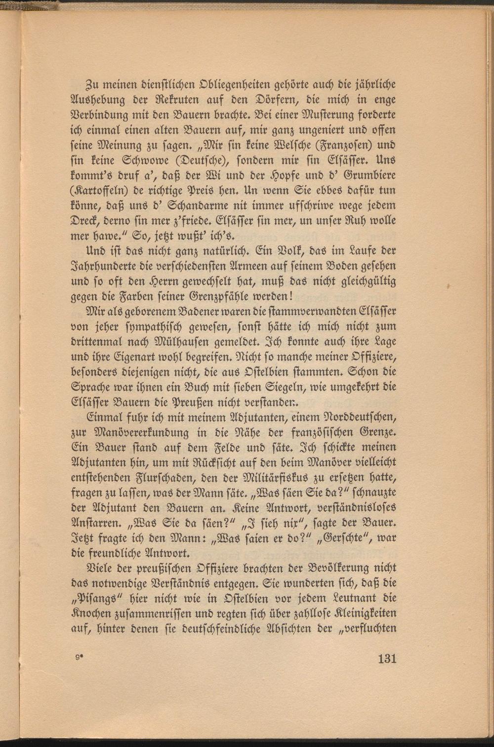 Mir als geborenem Badener waren die stammverwandten Elsasser von jeher sympathisch gewesen, sonst hätte ich mich nicht zum drittenmal nach Mülhausen gemeldet. Ich konnte auch ihre Lage und ihre Eigenart wohl begreifen. Nicht so manche meiner Offiziere, besonders diejenigen nicht, die aus Ostelbien stammten. Schon die Sprache war ihnen ein Buch mit sieben Siegeln, wie umgekehrt die Elsasser Bauern die Preußen nicht verstanden.