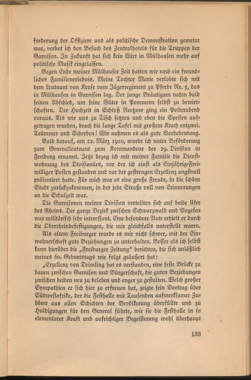 Bald darauf, am 22. März 1910, wurde ich unter Beförderung zum Generalleutnant zum Kommandeur der 29. Division in Freiburg ernannt. Jetzt bezog ich mit meiner Familie die Dienstwohnung des Divisionärs, vor der ich einst als Einjährig-Freiwilliger Posten gestanden und vor der gestrengen Exzellenz angstvoll präsentiert hatte. Für mich war es eine große Freude, in die schöne Stadt zurückzukommen, in der jede Straße voll von Erinnerungen an die Schulzeit war.