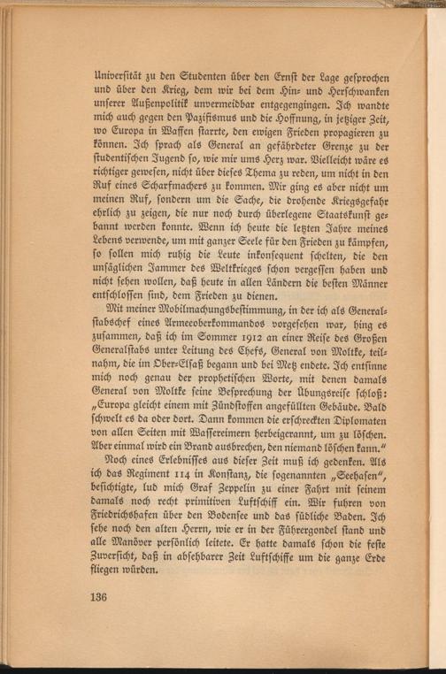 Universität zu den Studenten über den Ernst der Lage gesprochen und über den Krieg, dem wir bei dem Hin- und Herschwanken unserer Außenpolitik unvermeidbar entgegengingen. Ich wandte mich auch gegen den Pazifismus und die Hoffnung, in jetziger Zeit, wo Europa in Waffen starrte, den ewigen Frieden propagieren zu können. Ich sprach als General an gefährdeter Grenze zu der studentischen Jugend so, wie mir ums Herz war. Vielleicht wäre es richtiger gewesen, nicht über dieses Thema zu reden, um nicht in den Ruf eines Scharfmachers zu kommen. Mir ging es aber nicht um meinen Ruf, sondern um die Sache, die drohende Kriegsgefahr ehrlich zu zeigen, die nur noch durch überlegene Staatökunst gebannt werden konnte. Wenn ich heute die letzten Jahre meines Lebens verwende, um mit ganzer Seele für den Frieden zu kämpfen, so sollen mich ruhig die Leute inkonsequent schelten, die den unsäglichen Jammer des Weltkrieges schon vergessen haben und nicht sehen wollen, daß heute in allen Ländern die besten Männer entschlossen sind, dem Frieden zu dienen.