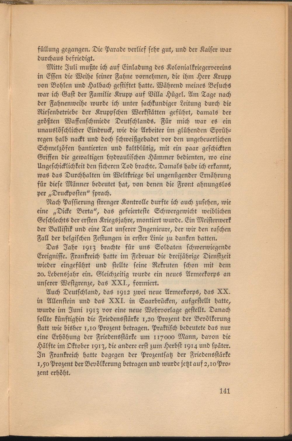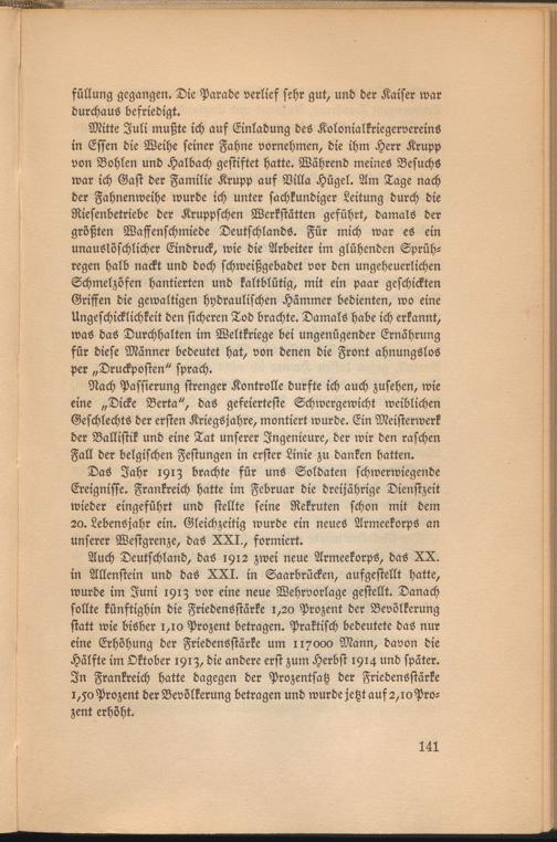 Mitte Juli mußte ich auf Einladung des KolonialkriegervereinS in Essen die Weihe seiner Fahne vornehmen, die ihm Herr Krupp von Bohlen und Halbach gestiftet hatte. Während meines Besuchs war ich Gast der Familie Krupp auf Villa Hügel. Am Tage nach der Fahnenweihe wurde ich unter sachkundiger Leitung durch die Riesenbetriebe der Kruppschen Werkstätten geführt, damals der größten Waffenschmiede Deutschlands. Für mich war es ein unauslöschlicher Eindruck, wie die Arbeiter im glühenden Sprühregen halb nackt und doch schweißgebadet vor den ungeheuerlichen Schmelzöfen hantierten und kaltblütig, mit ein paar geschickten Griffen die gewaltigen hydraulischen Hämmer bedienten, wo eine Ungeschicklichkeit den sicheren Tod brachte. Damals habe ich erkannt, was daS Durchhalten im Weltkriege bei ungenügender Ernährung für diese Männer bedeutet hat, von denen die Front ahnungslos per „Druckposten" sprach.