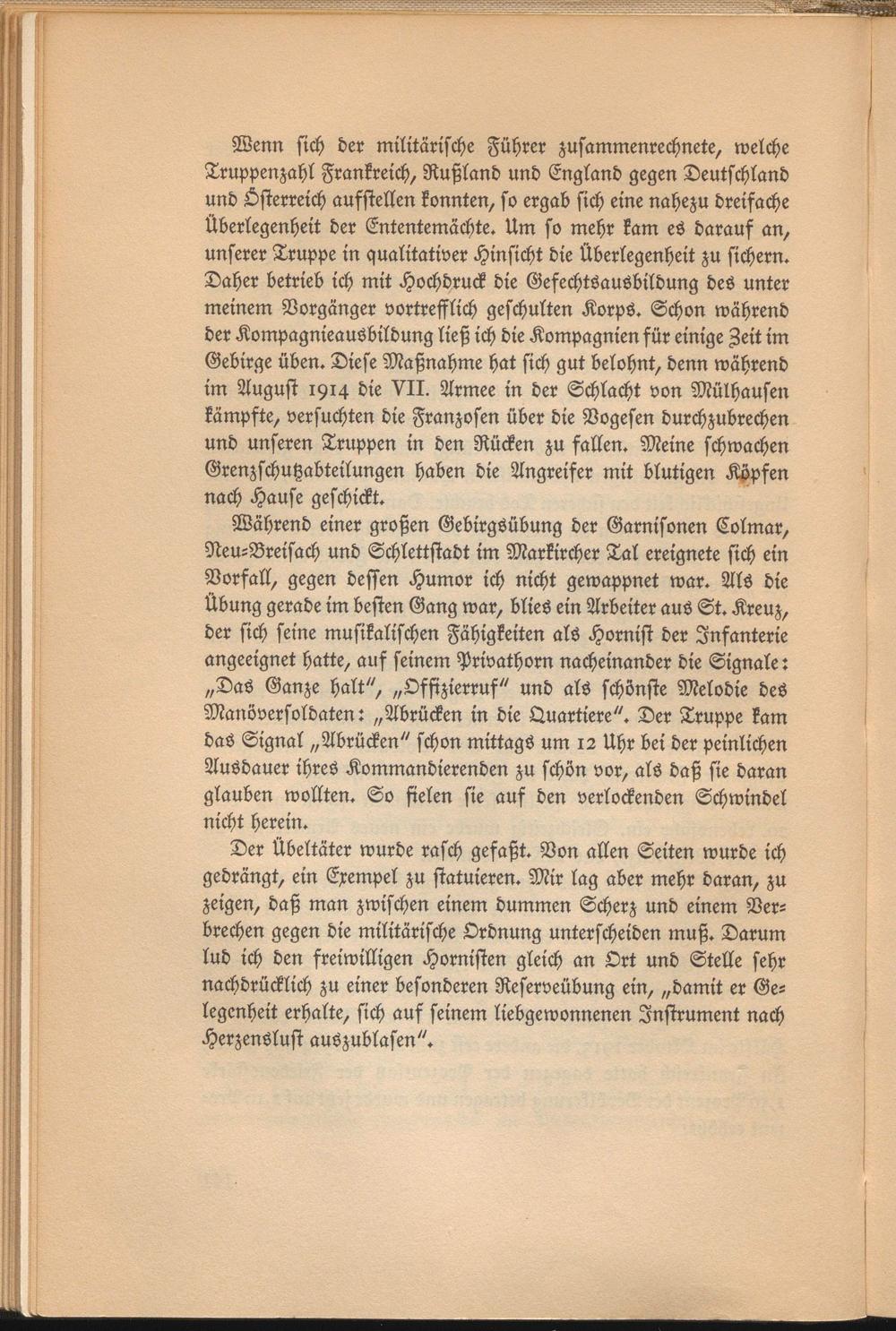 Während einer großen Gebirgsübung der Garnisonen Colmar, Neu-Breisach und Schlettstadt im Markircher Tal ereignete sich ein Vorfall, gegen dessen Humor ich nicht gewappnet war. Als die Übung gerade im besten Gang war, blies ein Arbeiter aus St. Kreuz, der sich seine musikalischen Fähigkeiten als Hornist der Infanterie angeeignet hatte, auf seinem Privathorn nacheinander die Signale: „Das Ganze halt", „Offizierruf" und als schönste Melodie deS Manöversoldaten: „Abrücken in die Quartiere". Der Truppe kam das Signal „Abrücken" schon mittags um 12 Uhr bei der peinlichen Ausdauer ihres Kommandierenden zu schön vor, als daß sie daran glauben wollten. So fielen sie auf den verlockenden Schwindel nicht herein.