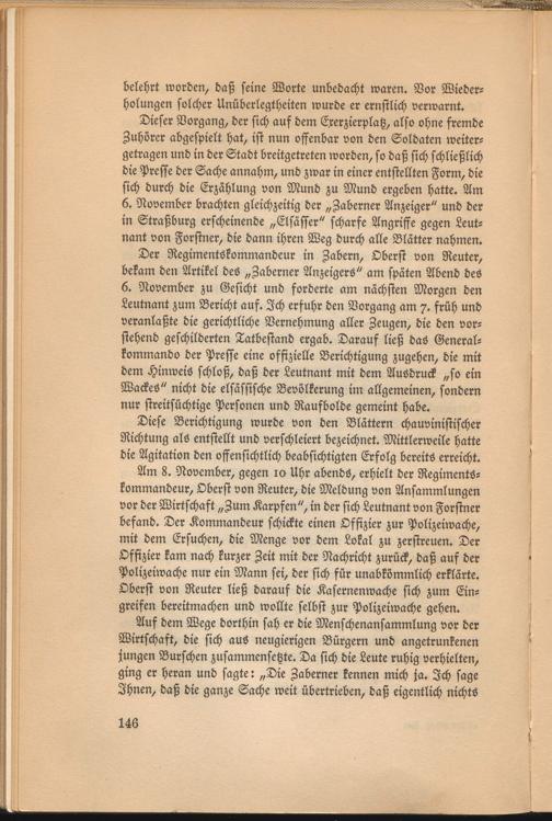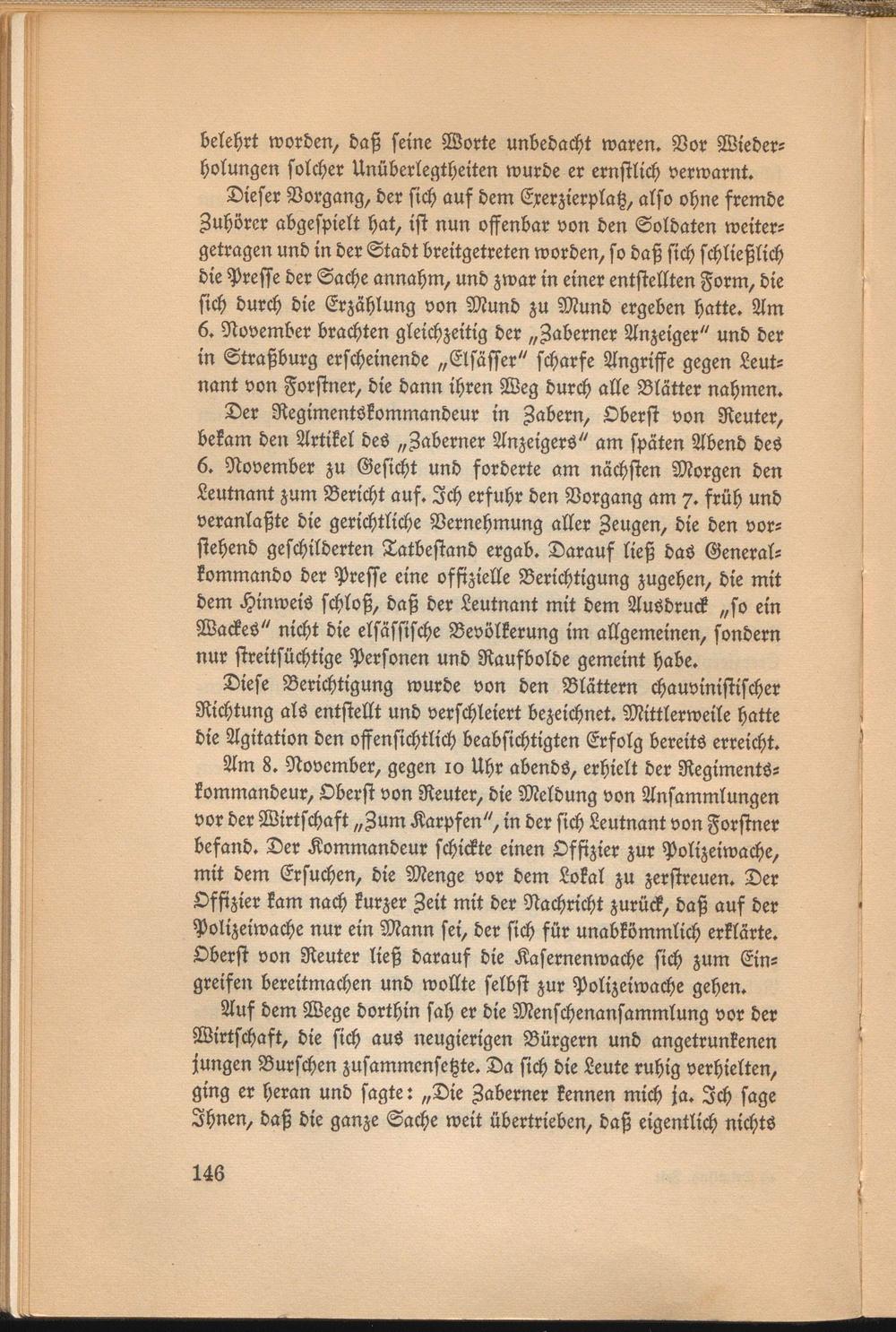 Der Regimentskommandeur in Jabern, Oberst von Reuter, bekam den Artikel des „Zaberner Anzeigers" am späten Abend des 6. November zu Gesicht und forderte am nächsten Morgen den Leutnant zum Bericht auf. Ich erfuhr den Vorgang am 7. früh und veranlaßte die gerichtliche Vernehmung aller Zeugen, die den vorstehend geschilderten Tatbestand ergab. Darauf ließ das Generalkommando der Presse eine offizielle Berichtigung zugehen, die mit dem Hinweis schloß, daß der Leutnant mit dem Ausdruck „so ein WackeS" nicht die elsässische Bevölkerung im allgemeinen, sondern nur streitsüchtige Personen und Raufbolde gemeint habe.
