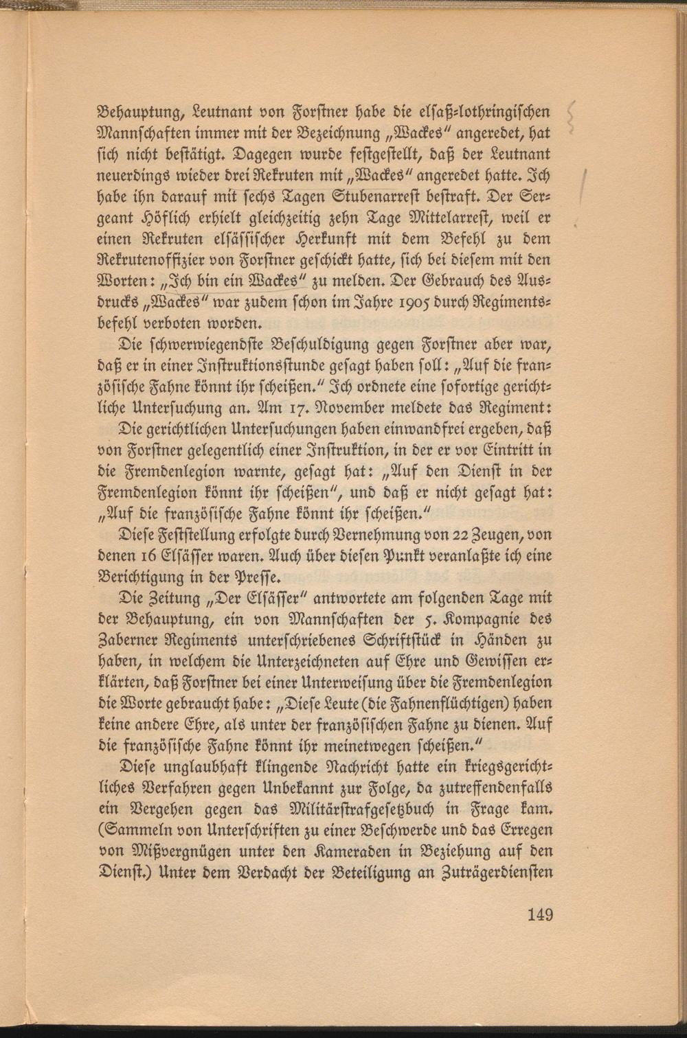 Die Zeitung „Der Elsässer" antwortete am folgenden Tage mit der Behauptung, ein von Mannschaften der 5. Kompagnie des Zaberner Regiments unterschriebenes Schriftstück in Händen zu haben, in welchem die Unterzeichneten auf Ehre und Gewissen erklärten, daß Forstner bei einer Unterweisung über die Fremdenlegion die Worte gebraucht habe: „Diese Leute (die Fahnenflüchtigen) haben keine andere Ehre, als unter der französischen Fahne zu dienen. Auf die französische Fahne könnt ihr meinetwegen scheißen."