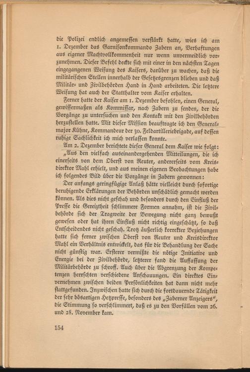 Ferner hatte der Kaiser am i. Dezember befohlen, einen General, gewissermaßen als Kommissar, nach Zabern zu senden, der die Vorgänge zu untersuchen und den Kontakt mit den Zivilbehörden herzustellen hatte. Mit dieser Mission beauftragte ich den Generalmajor Kühne, Kommandeur der zo. Feldartilleriebrigade, auf dessen ruhige Sachlichkeit ich mich verlassen konnte.