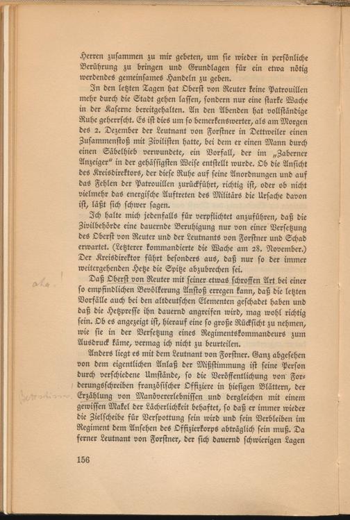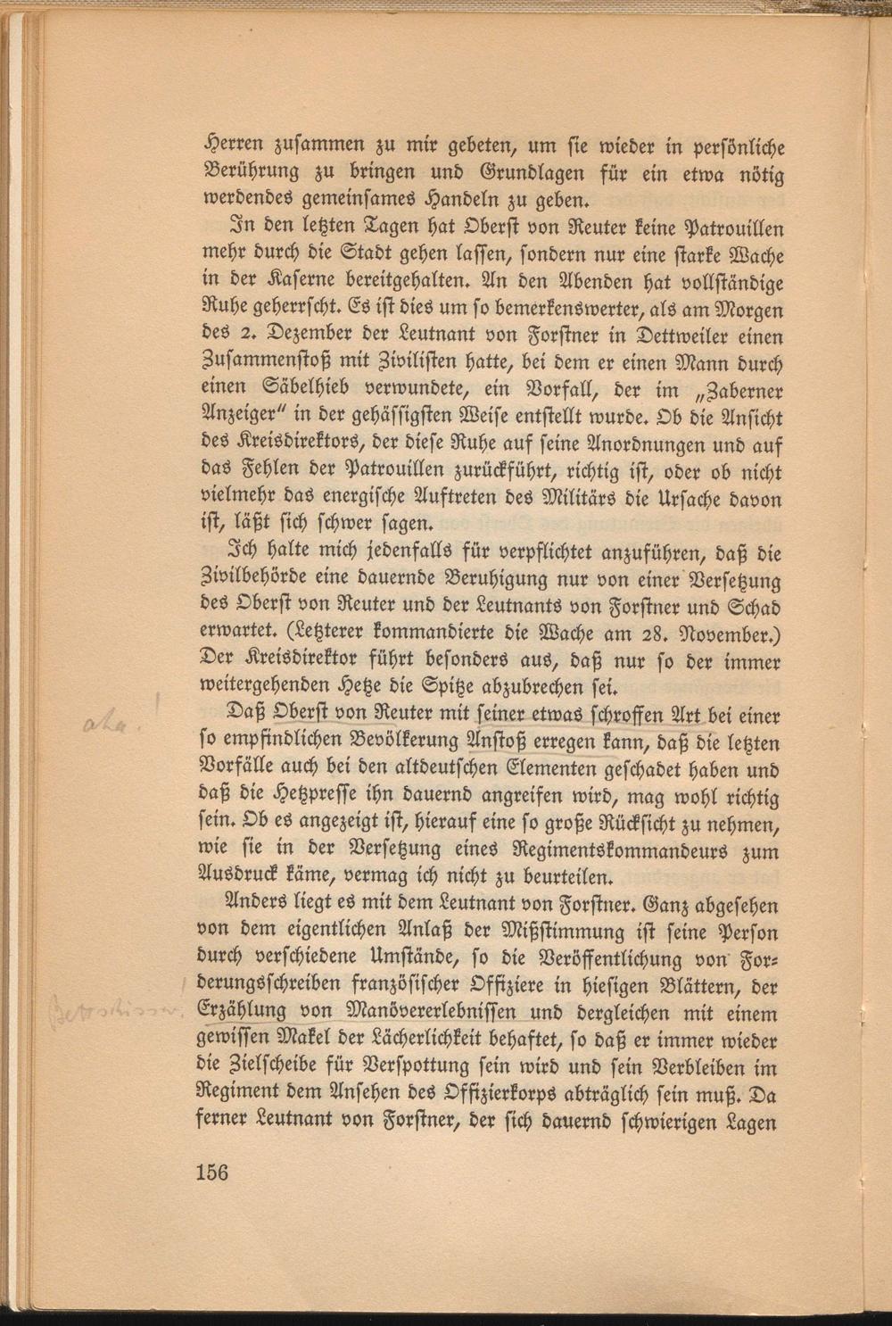 In den letzten Tagen hat Oberst von Reuter keine Patrouillen mehr durch die Stadt gehen lasten, sondern nur eine starke Wache in der Kaserne bereitgehalten. An den Abenden hat vollständige Ruhe geherrscht. Es ist dies um so bemerkenswerter, als am Morgen des 2. Dezember der Leutnant von Forstner in Dettweiler einen Zusammenstoß mit Zivilisten hatte, bei dem er einen Mann durch einen Säbelhieb verwundete, ein Vorfall, der im „Zaberner Anzeiger" in der gehässigsten Weise entstellt wurde. Ob die Ansicht des Kreisdirektors, der diese Ruhe auf seine Anordnungen und auf das Fehlen der Patrouillen zurückführt, richtig ist, oder ob nicht vielmehr das energische Auftreten des Militärs die Ursache davon ist, läßt sich schwer sagen.