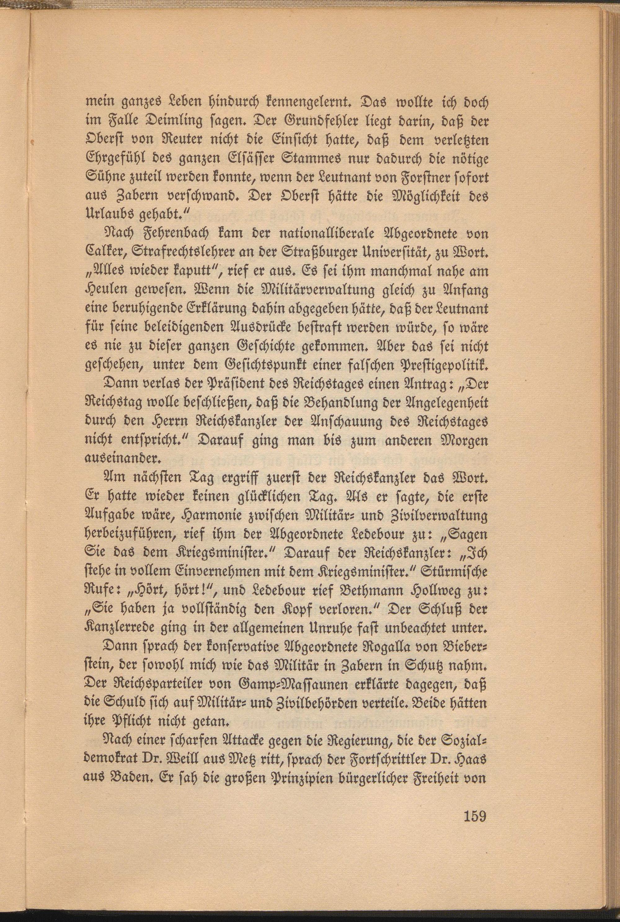 mein ganzes Leben hindurch kennengelernt. Das wollte ich doch im Falle Deimling sagen. Der Grundfehler liegt darin, daß der Oberst von Reuter nicht die Einsicht hatte, daß dem verletzten Ehrgefühl des ganzen Elsässer Stammes nur dadurch die nötige Sühne zuteil werden konnte, wenn der Leutnant von Forstner sofort aus Jabern verschwand. Der Oberst hätte die Möglichkeit des Urlaubs gehabt."