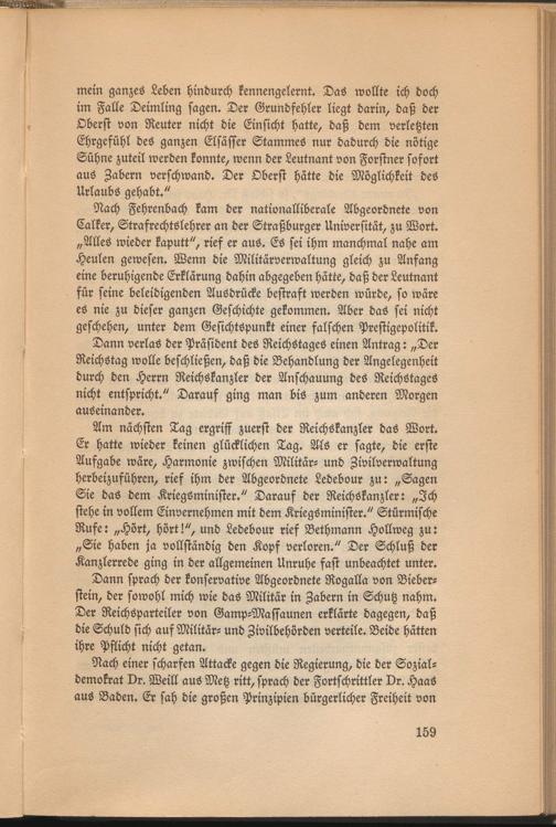 Nach Fehrenbach kam der nationalliberale Abgeordnete von Calker, Strasrechtslehrer an der Straßburger Universität, zu Wort. „Alles wieder kaputt", rief er aus. Es sei ihm manchmal nahe am Heulen gewesen. Wenn die Militärverwaltung gleich zu Anfang eine beruhigende Erklärung dahin abgegeben hätte, daß der Leutnant für seine beleidigenden Ausdrücke bestraft werden würde, so wäre es nie zu dieser ganzen Geschichte gekommen. Aber das sei nicht geschehen, unter dem Gesichtspunkt einer falschen Prestigepolitik.
