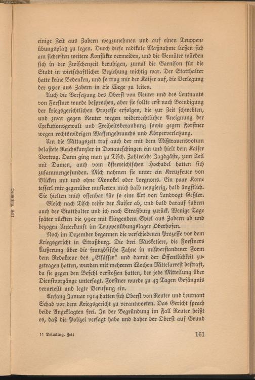 einige Zeit aus Zabern wegzunehmen und auf einen Truppenübungsplatz zu legen. Durch diese radikale Maßnahme ließen sich am sichersten weitere Konflikte vermeiden, und die Gemüter würden sich in der Zwischenzeit beruhigen, zumal die Garnison für die Stadt in wirtschaftlicher Beziehung wichtig war. Der Statthalter hatte keine Bedenken, und so trug mir der Kaiser auf, die Verlegung der 99er aus Zabern in die Wege zu leiten.