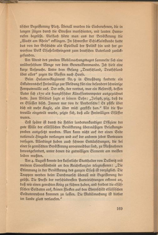 Am 4. August konnte der kaiserliche Statthalter von Dallwitz mit meinem Einverständnis an den Reichskanzler telegrafieren: „Die Stimmung in der Bevölkerung des ganzen Elsaß ist vorzüglich. Die Truppen werden beim Durchmarsch überall mit Begeisterung begrüßt. Die Presse der verschiedensten Parteirichtungen erkennt an, daß wir einen gerechten Krieg zu führen haben, und fordert die elsässischen Soldaten auf, keinen Flecken auf den Ehrenschild elsässischen Soldatenruhms kommen zu lassen. Die Mobilmachung ist bisher im Lande glatt verlausen."