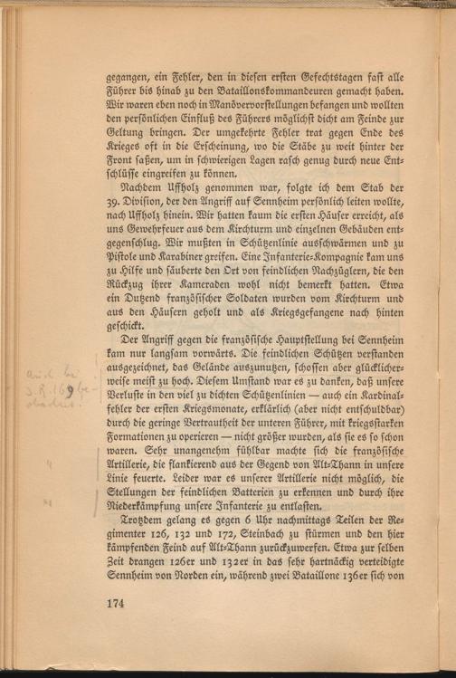 Trotzdem gelang es gegen 6 Uhr nachmittags Teilen der Regimenter 126, iZ2 und 172, Steinbach zu stürmen und den hier kämpfenden Feind auf Alt-Thann zurückzuwerfen. Etwa zur selben Zeit drangen 126 er und iZ2er in das sehr hartnäckig verteidigte Sennheim von Norden ein, während zwei Bataillone iz6er sich von