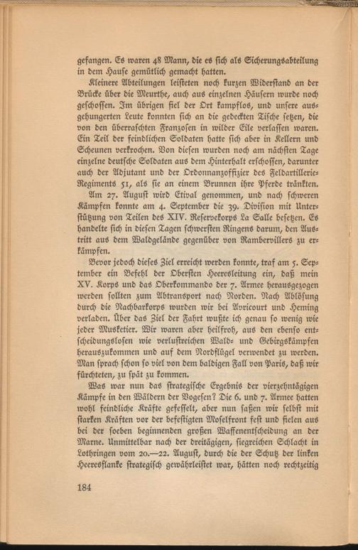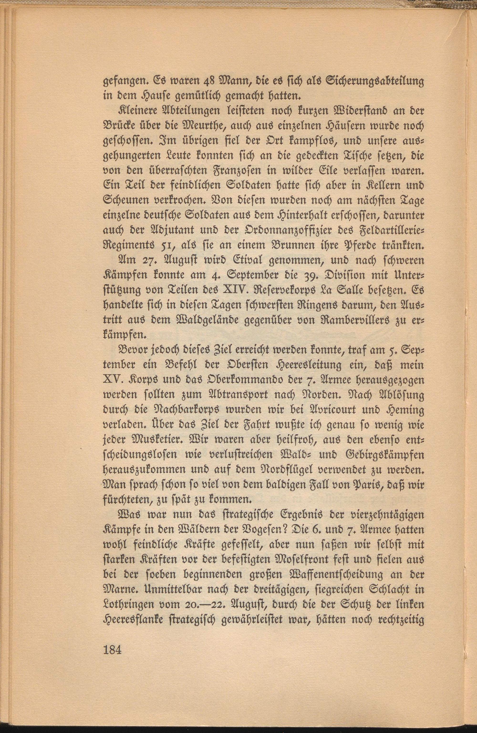 Bevor jedoch dieses Ziel erreicht werden konnte, traf am 5. September ein Befehl der Obersten Heeresleitung ein, daß mein XV. Korps und das Oberkommando der 7. Armee herausgezogen werden sollten zum Abtransport nach Norden. Nach Ablösung durch die Nachbarkorps wurden wir bei Avricourt und Heming verladen. Über das Ziel der Fahrt wußte ich genau so wenig wie jeder Musketier. Wir waren aber heilfroh, aus den ebenso ent- scheidungslosen wie verlustreichen Wald- und Gebirgökämpfen herauszukommen und auf dem Nordflügel verwendet zu werden. Man sprach schon so viel von dem baldigen Fall von Paris, daß wir fürchteten, zu spät zu kommen.